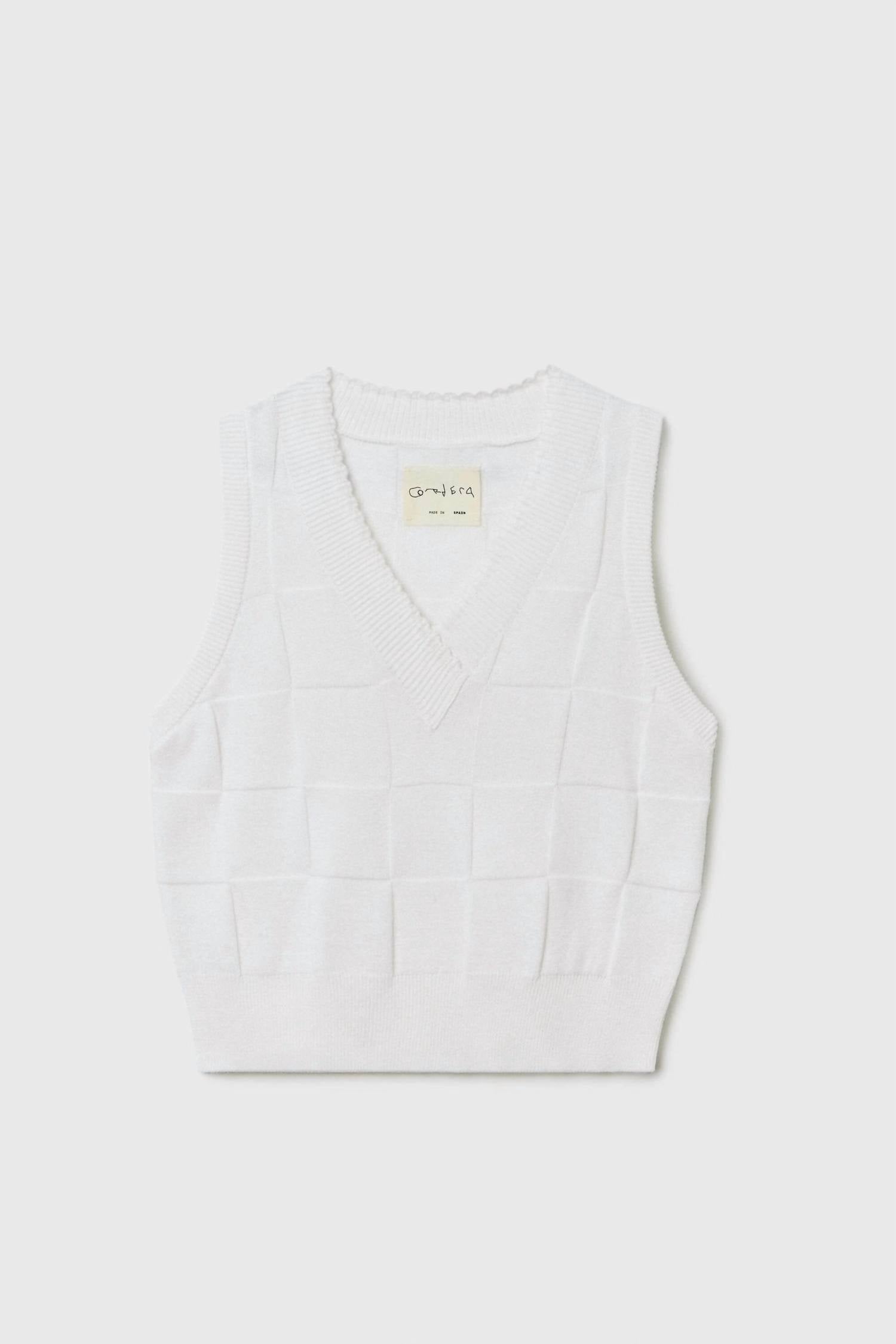 Discover the Checkered Cotton & Cashmere Waistcoat by Cordera, an elegant piece available in versatile white. This sleeveless vest is expertly crafted from an 85% Superior Cotton and 15% Cashmere blend, providing a luxurious feel with a checkered texture and ribbed crossed V-neck. Made in Spain, this waistcoat features pull-on closure, making it perfect for easy layering or standalone wear. Care for it by hand washing, avoiding bleach, and drying flat; it can also be ironed on low heat or dry cleaned. It is one size, fitting US sizes 2 through 10, with a design perfect for minimalist, vacation-ready styling.