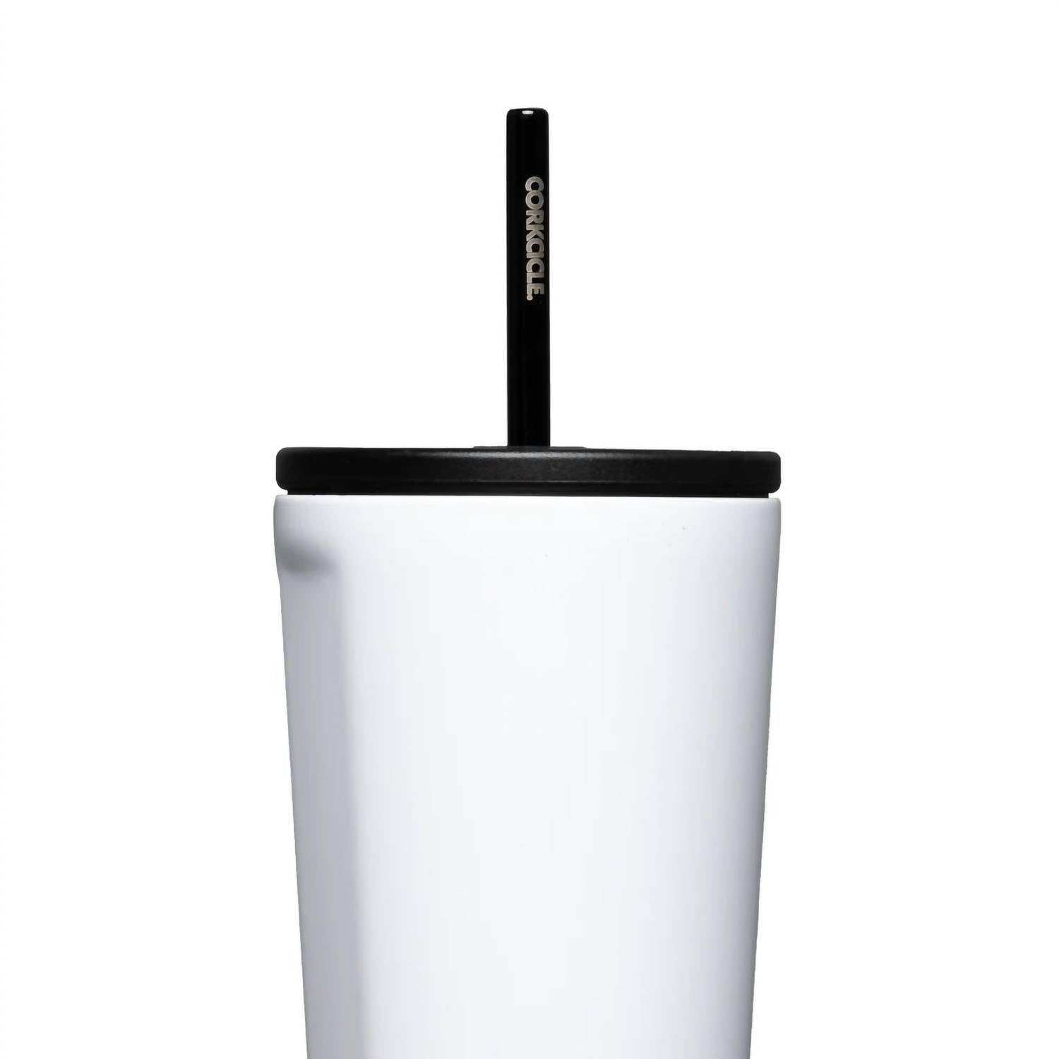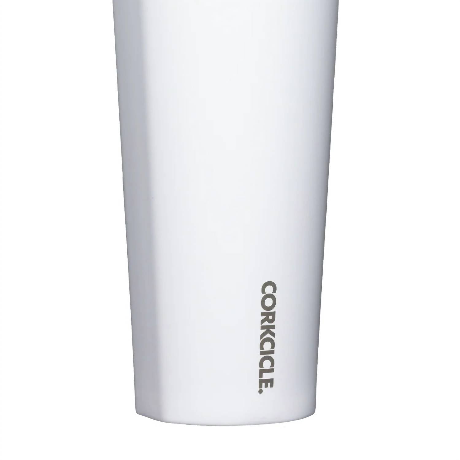 Introducing the Cold Cup 24 Oz. by CORKCICLE, a sleek and functional beverage holder in gloss white designed to keep your drink cold for 12 hours. Its easy-grip flat sides and silicone straw tab allow for flexible drinking angles, making it both user-friendly and stylish. The triple-insulated design is BPA free and cupholder friendly, with a size that measures 3.75 inches in length and width, standing 8.43 inches tall, and weighing 1.05 lbs. Care is simple, as it is dishwasher safe, ensuring convenience in your everyday hydration.