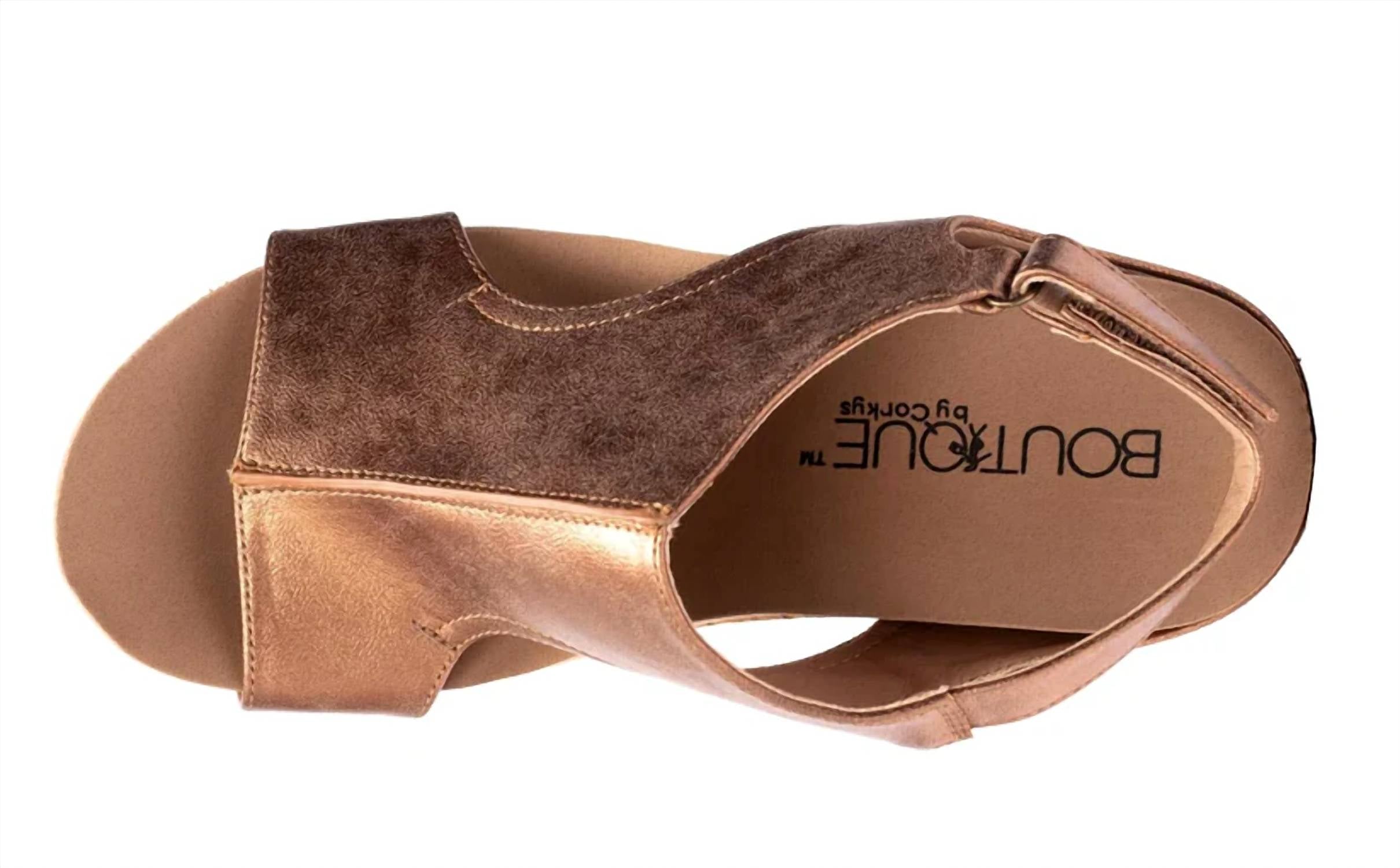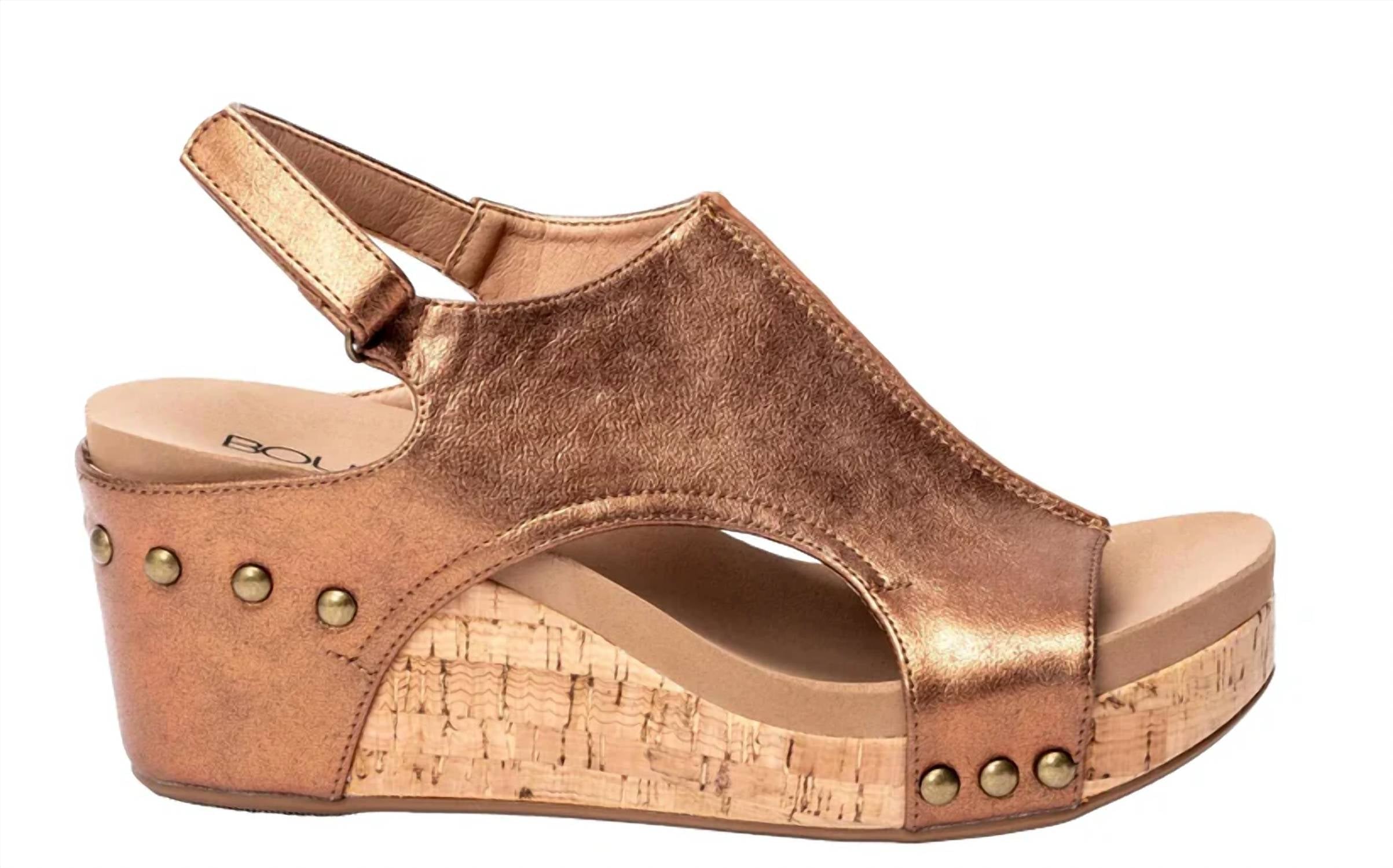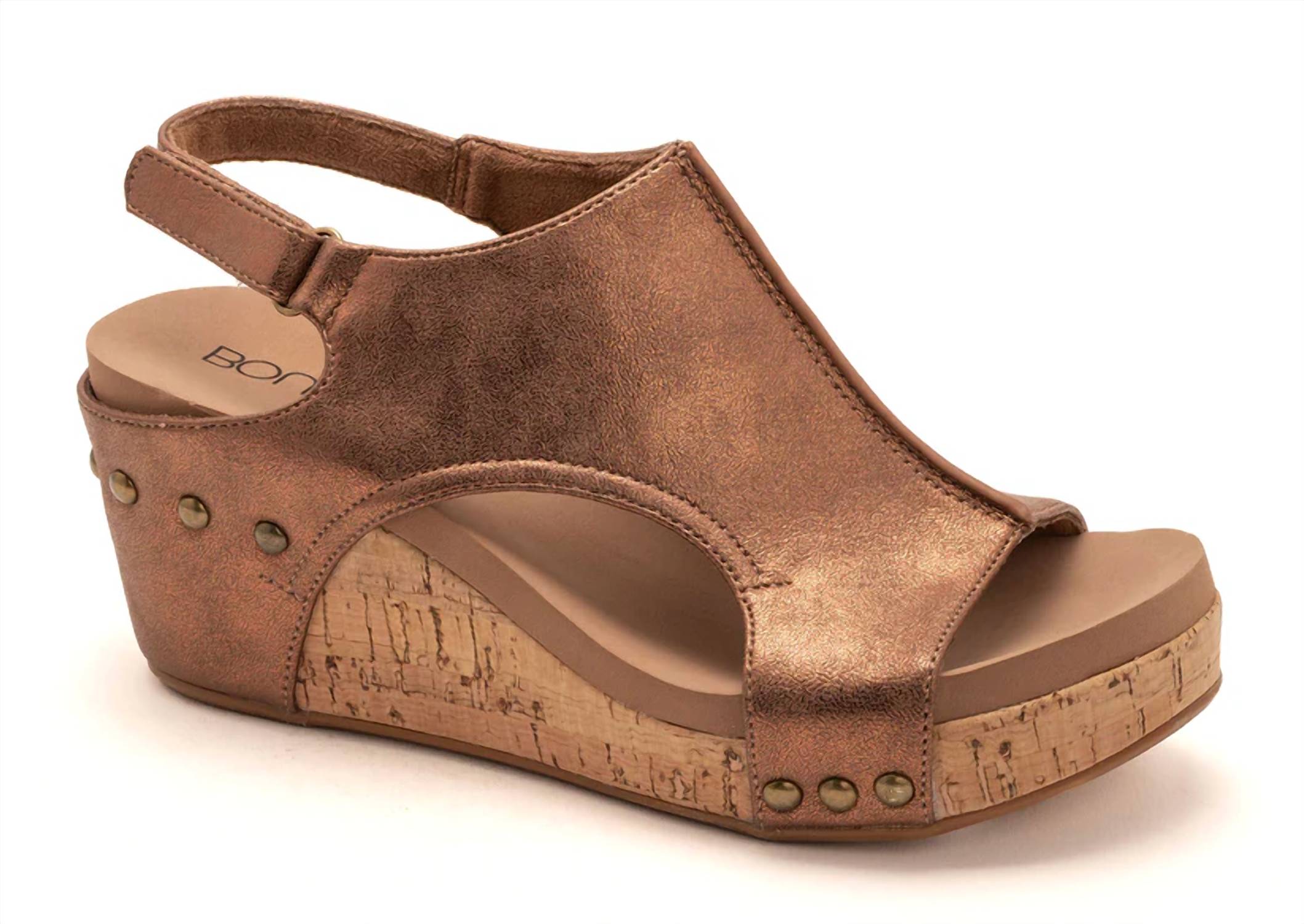 Elevate your footwear game with these adorable wedges. Step into style with the Women's Carley Wedge Sandal by Corkys Footwear in a captivating antique bronze. This sandal features a faux leather upper adorned with striking stud accents and an adjustable Velcro strap for a perfect fit. The 2.5-inch cork platform wedge heel and 1-inch platform height are complemented by an EVA cushioned insole and rubber outsole for optimal comfort. Ideal for women seeking both flair and functionality.
