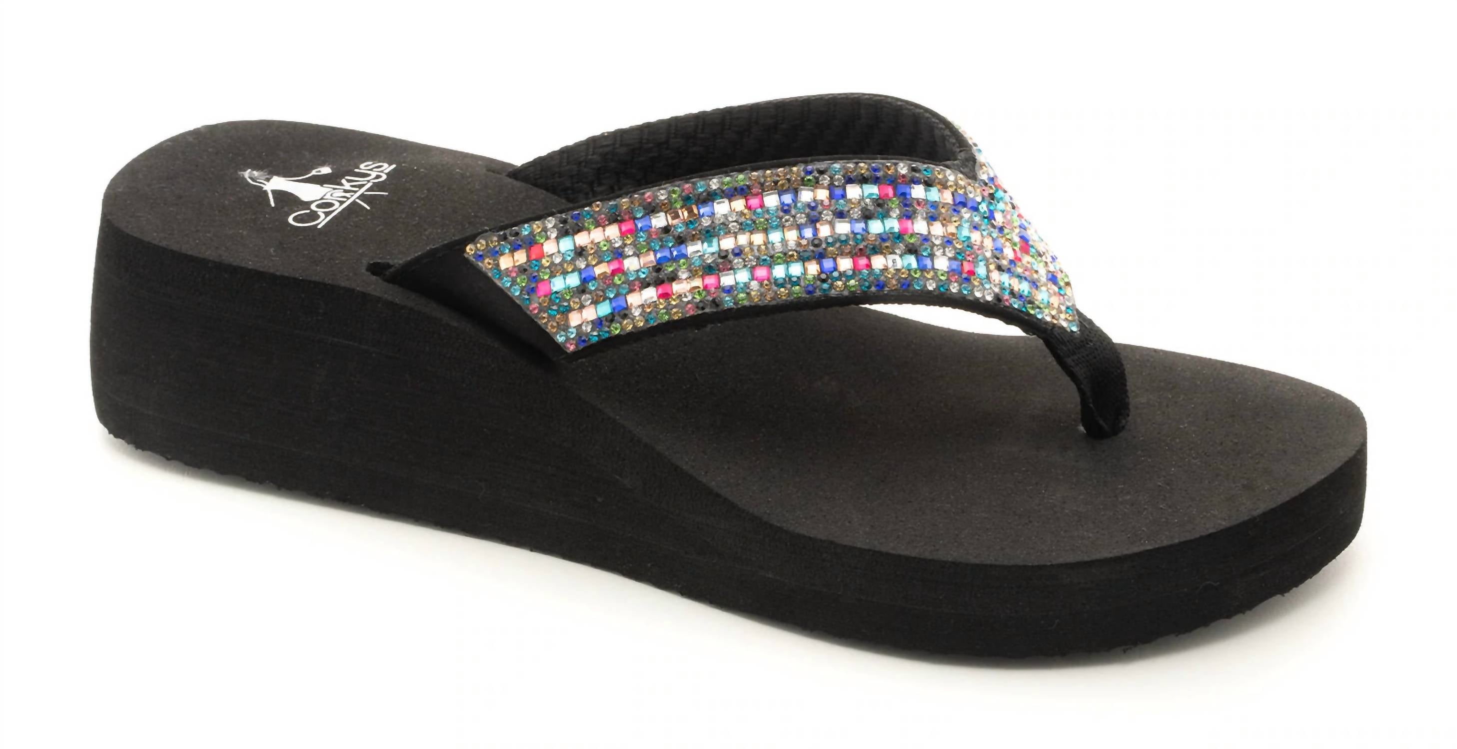 Elevate your footwear game with these adorable wedges. Step into style with the Women's Clara Wedge from Corkys Footwear, a chic addition to your shoe collection. These black wedges feature an open-toe design and a comfortable wedge heel, ideal for all-day wear. Crafted to fit true to size, it's recommended to size up if you're a half size. These versatile wedges might be shipped without a box.