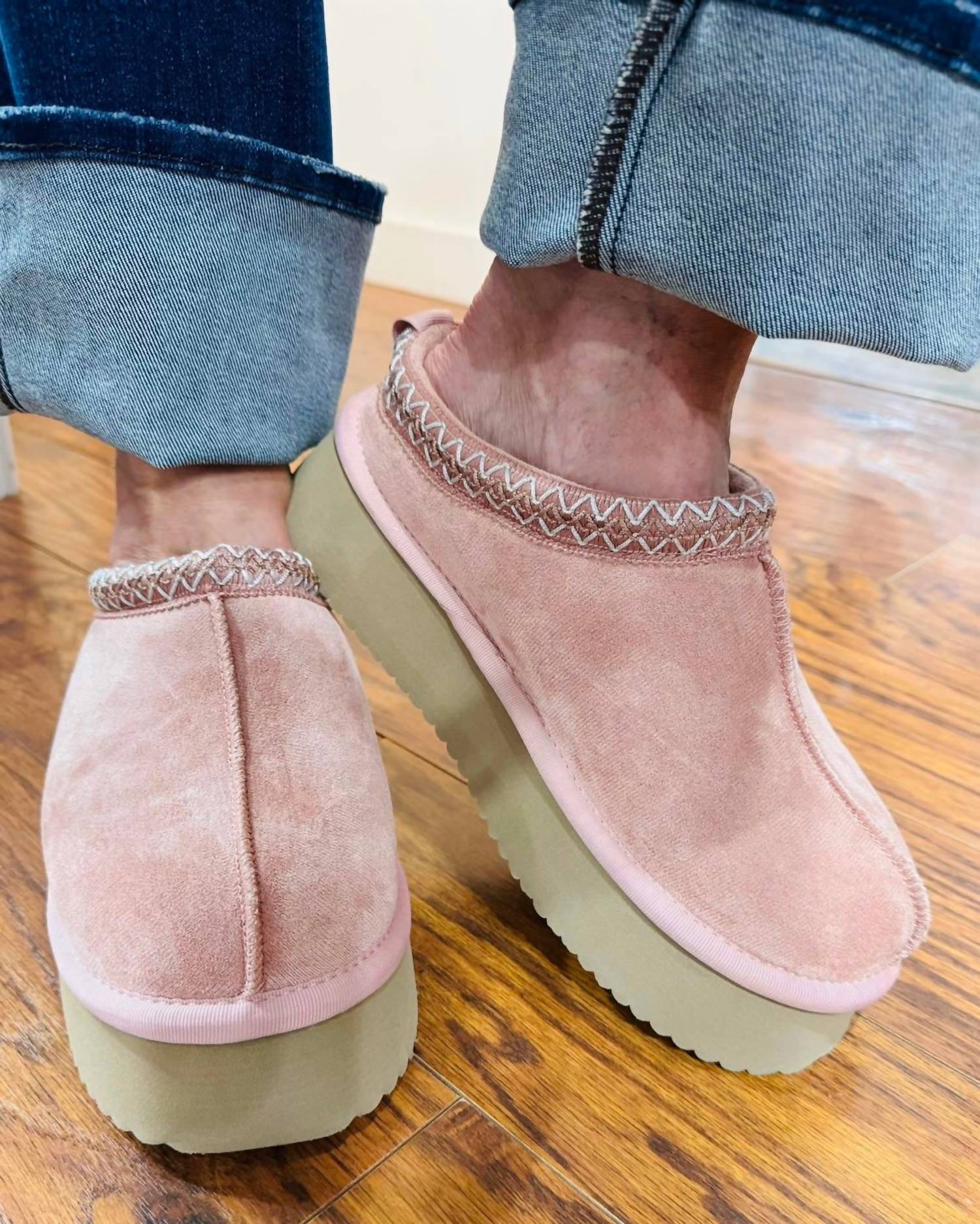A trend that everyone is loving and this style might just be our favorite. Experience ultimate comfort and style in a chic blush hue. Crafted from soft faux suede. Showcase a luxurious fur interior, ensuring a cozy fit. With a 1.5-inch platform heel. Featuring a round toe design. Perfect blend of fashion and ease.