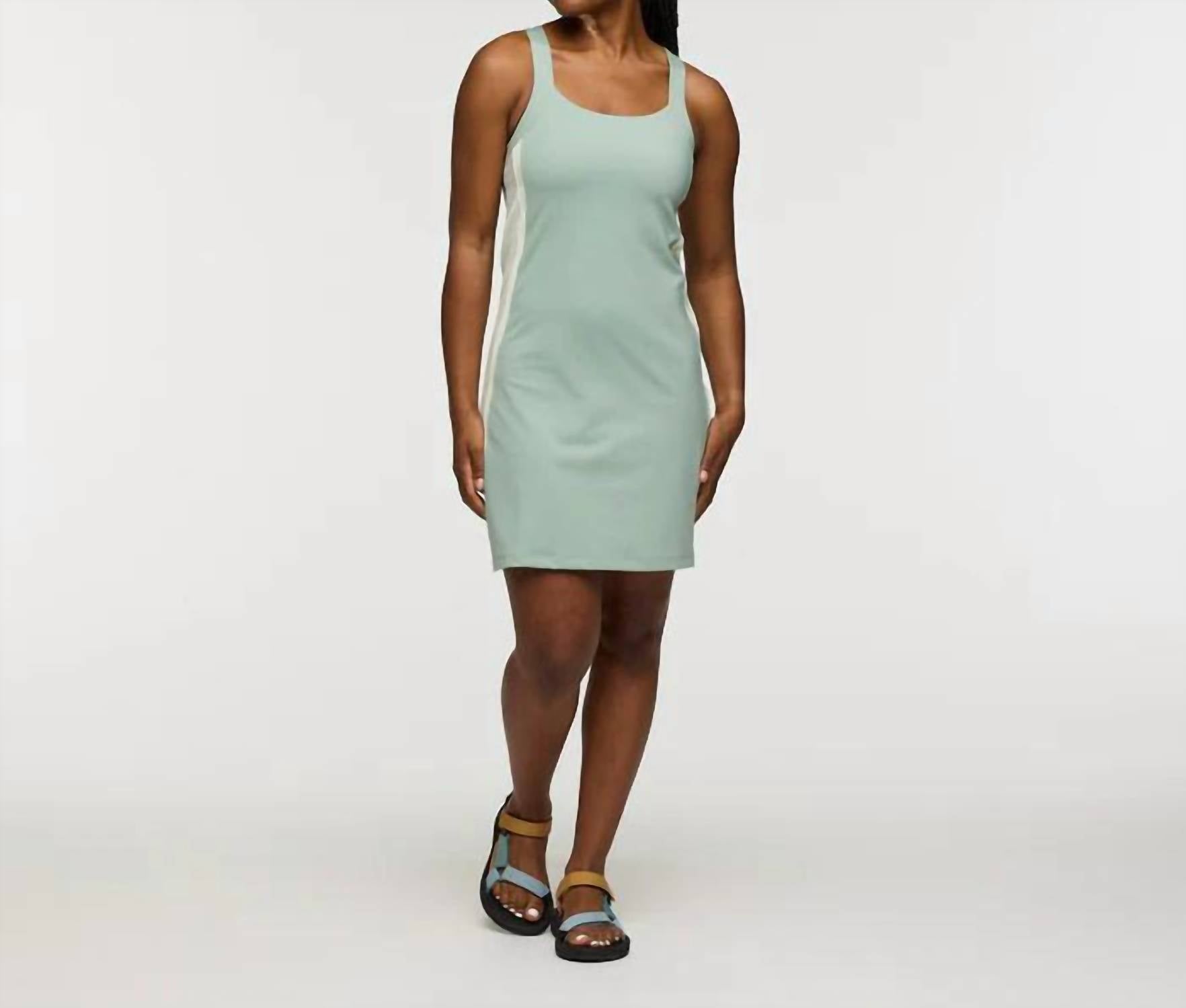 Experience ultimate versatility with the Cotopaxi Women's Muevo Active Dress in Silver Leaf, perfect for adventures on and off the trail. This sleeveless mini dress is designed with a supportive racerback style and crafted from a recycled nylon-spandex blend for comfortable compression and breathability. It features a pull-on closure, a convenient phone-compatible side pocket, and a built-in elastic shelf bra for added support. Composition: 74% recycled nylon, 26% spandex. Care instructions: Machine wash.