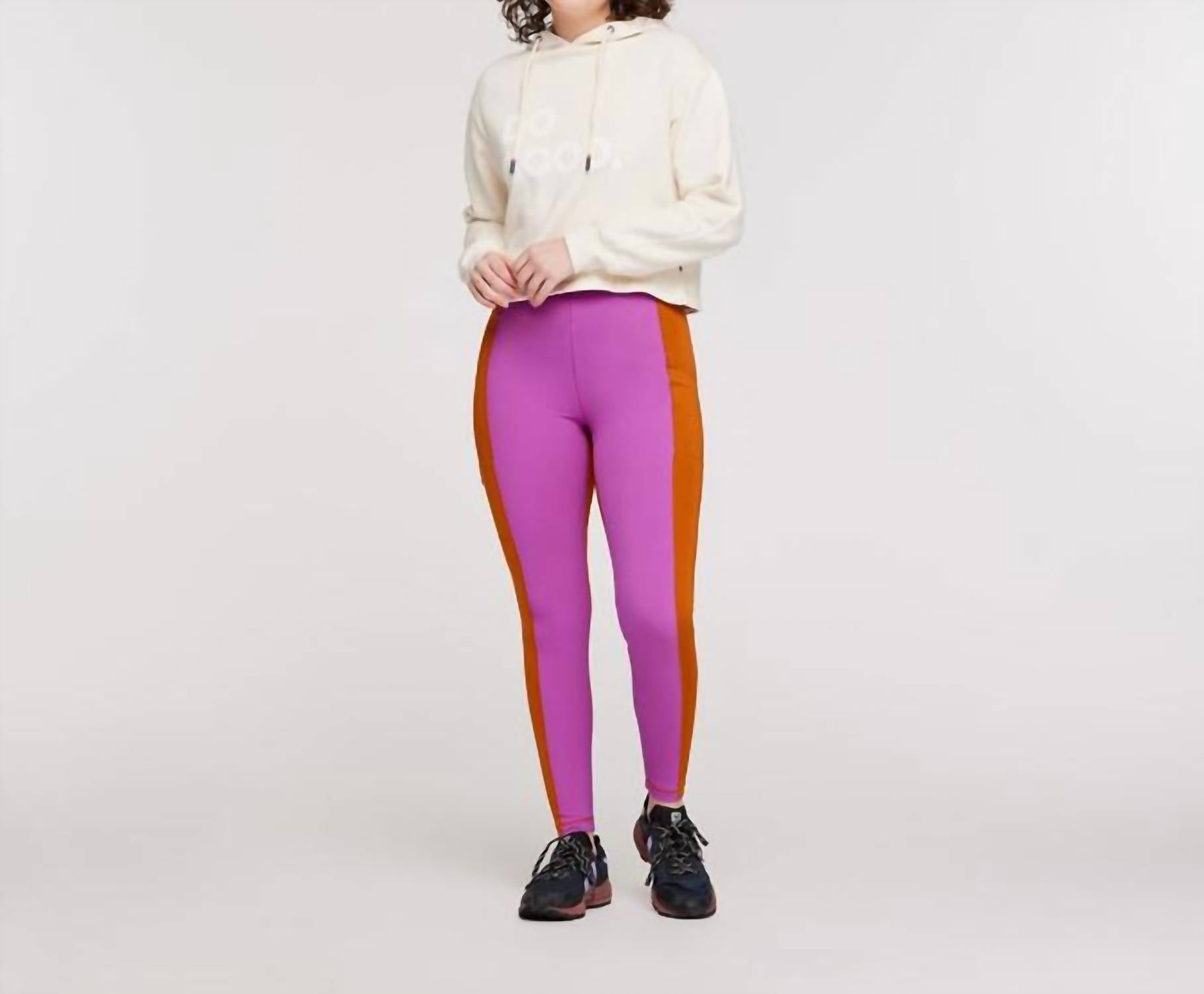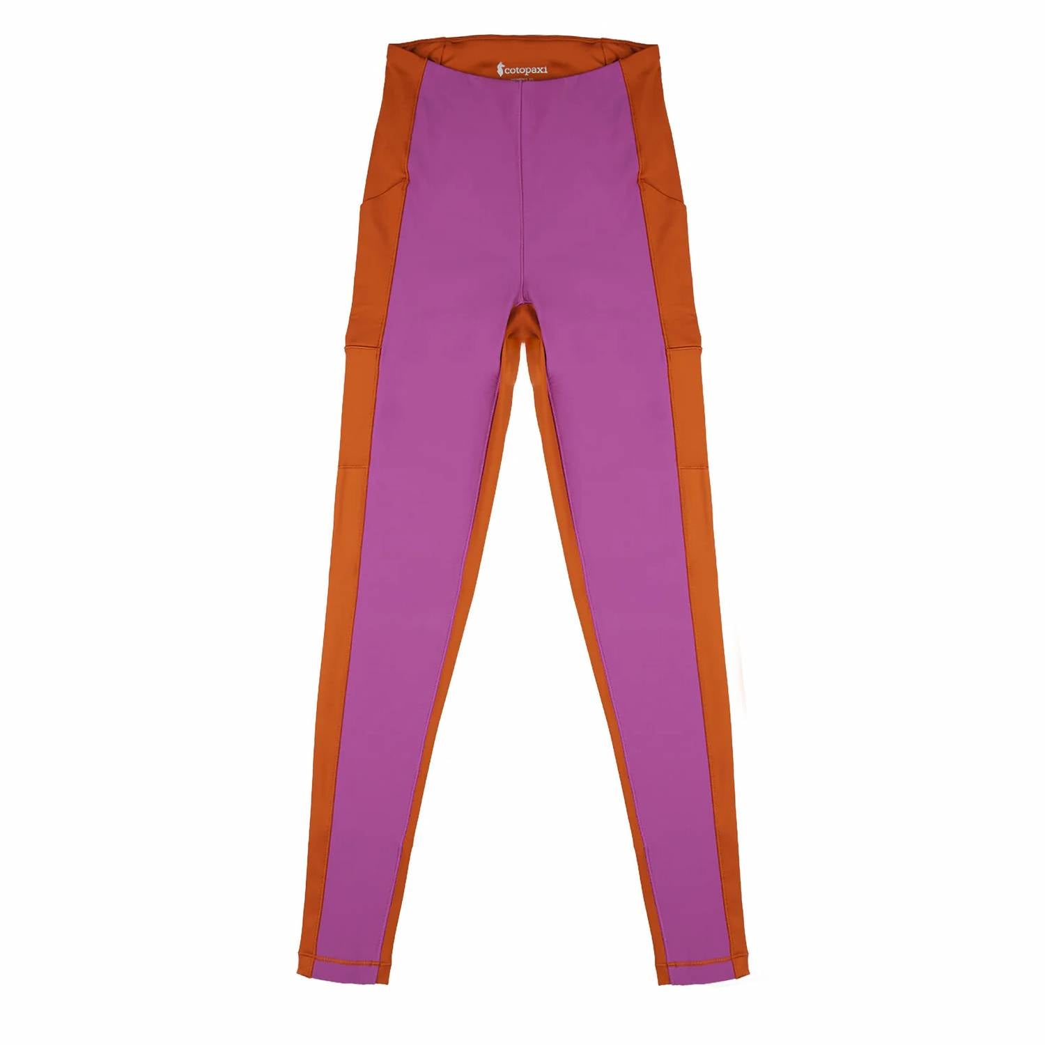 You'll be reaching for this best-selling legging all season long. Discover the Verso Hike Tight by Cotopaxi, designed for women who love adventure in style with its Mezcal-foxglove patterned design. These leggings feature a high-rise waist and skinny leg style, perfect for a multitude of outdoor activities. Its composition includes a durable yet stretchy blend of 79% recycled polyester and 21% spandex (240gsm) for the knit shell, and 86% recycled nylon with 14% spandex (137gsm) for the woven shell. The tights boast a functional design with slide-in hand pockets and an invisible zipper card and key leg pocket, ensuring essentials are secure, all while resisting abrasions. Perfect for fall hiking with a 26.75” inseam, and made easy-to-care with a pull-on closure, machine wash instructions, and lay flat to dry.