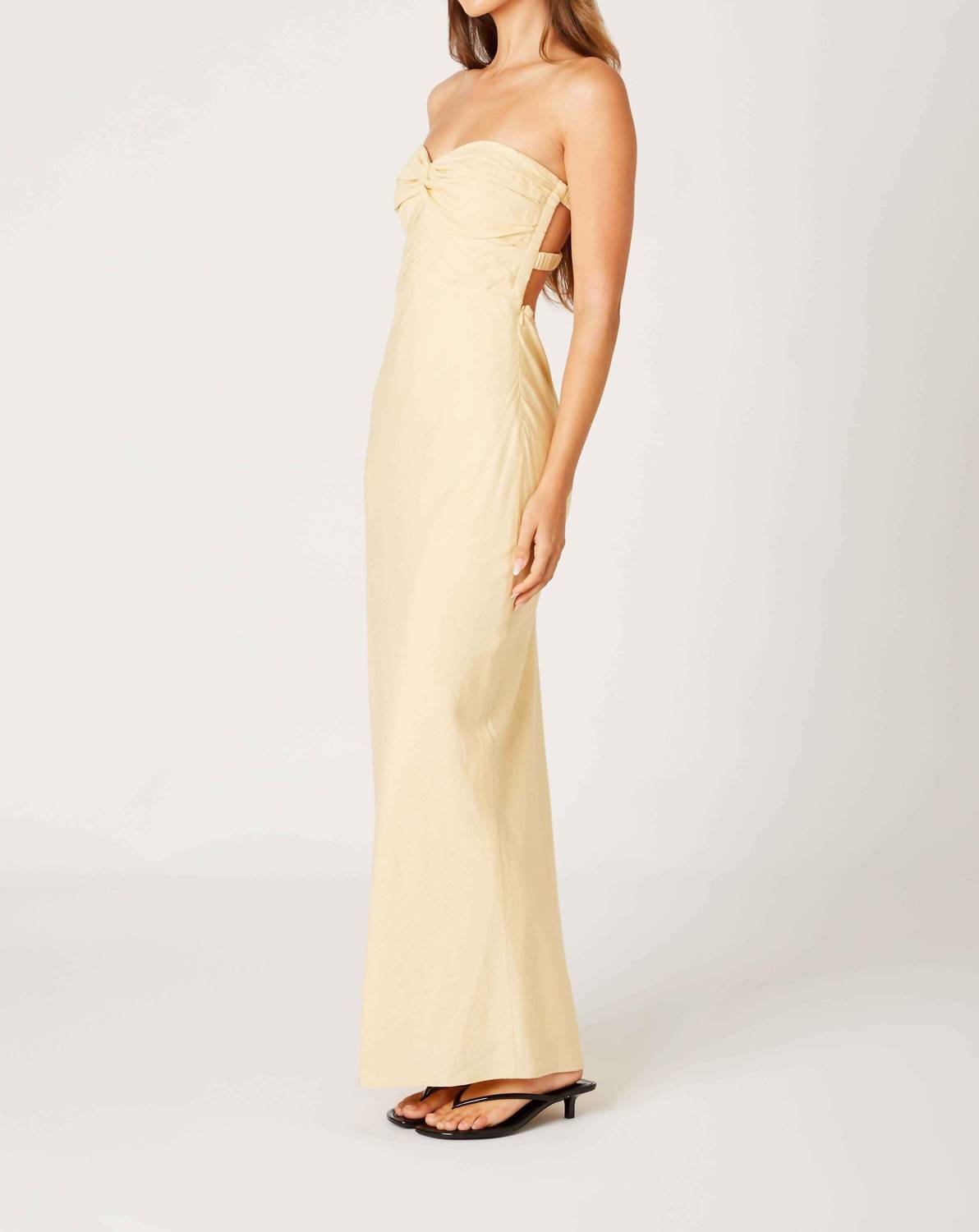 The pefect strapless dress for those warmer months. Add a cardigan for those cooler summer nights. Elevate your summer wardrobe with the chic butter-colored sheath dress perfect for any holiday party. Strapless design features a twist ruched bodice with double elastic crisscross back straps for a secure, stylish fit. Crafted from a blend of rayon and linen. Promises comfort while maintaining a sophisticated silhouette. Pull on closure. Ideal for embracing the Y2k trend with its modern sweetheart neckline.