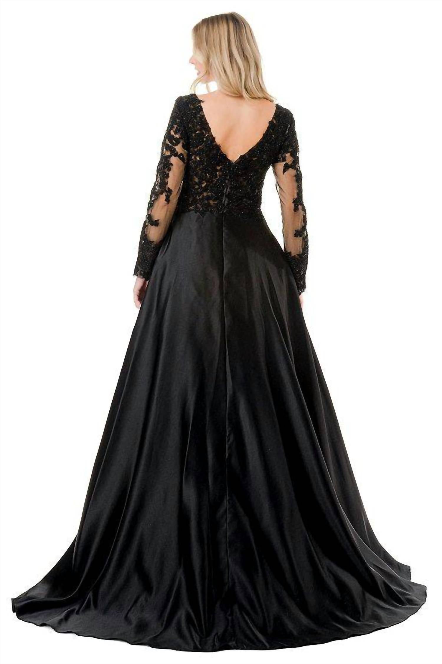 Just add a cute little clutch and a matching heel for the perfect event look. Discover the Evening Gown by Coya Collection, a sophisticated choice for any formal affair. This black gown features exquisite long sheer lace sleeves and a fitted bodice decorated with intricate beading, all enhanced by a deep V-neckline that creates an elegant silhouette. The full satin skirt flows gracefully to the floor, ensuring a timeless and striking appearance. Ideal for winter events, this dress is a perfect pick for galas and special occasions.
