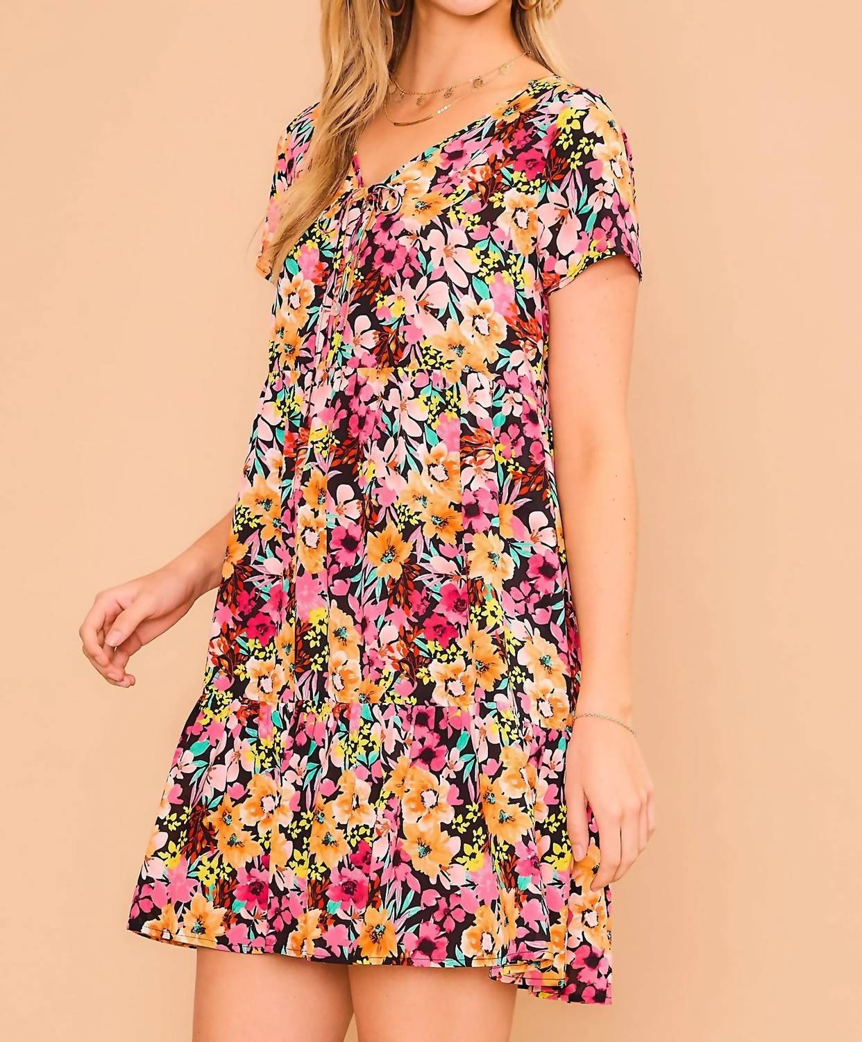Discover the Floral Short Sleeve Tiered Dress by Cozy Co., a delightful choice for your spring wardrobe. This mini A-line dress offers a charming V-neck design with short sleeves and a fixed chest tie detail, complete with decorative buttons. Made from 100% Polyester, it includes convenient side seam pockets and a button closure. To maintain its vibrant pattern, hand wash and line dry for best results. Perfectly suited for a holiday party, especially Valentine's Day, this dress embodies a maximalist trend.