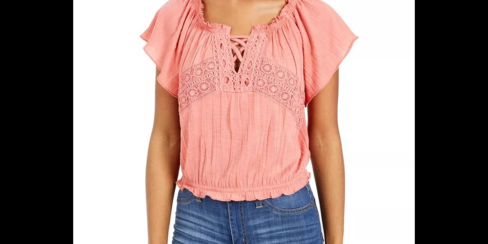 Off-the-shoulder neckline with crisscross inset|Crocheted detail at front; ruffle detail at neckline and hem|Runs small; we suggest sizing up for the perfect fit|Polyester|Machine washable