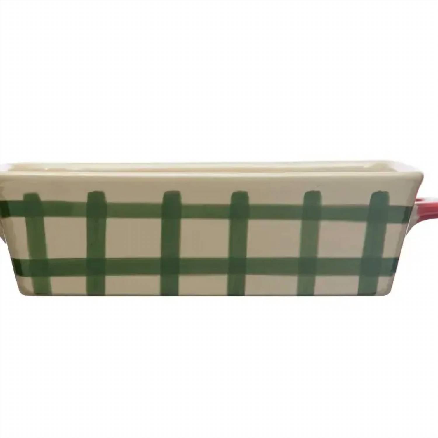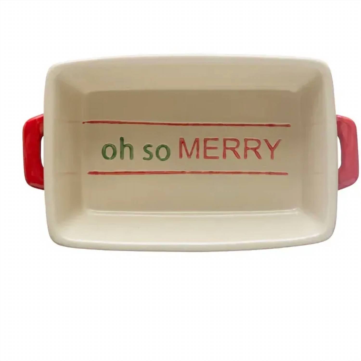 Stoneware baker with festive "Oh So Merry" design. Red & Green rim adds a seasonal touch. Durable material for holiday baking. Dimensions: 12.0" x 6.8". Perfect for creating festive treats and dishes.