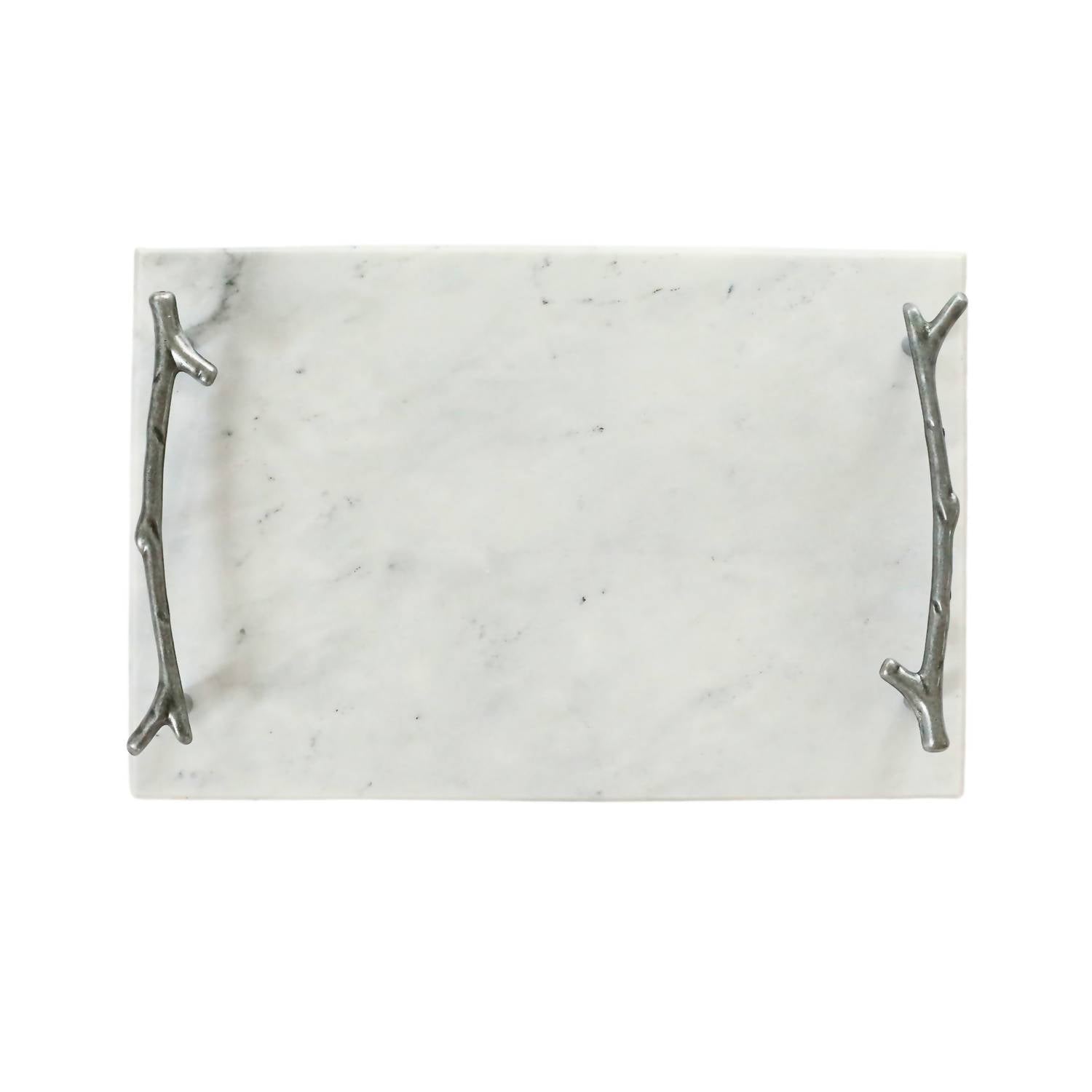 8" L x 12" W, providing a substantial area for your serving needs. Material: Crafted from white marble and complemented by silver branch handles. Functional Design: The cool surface is ideal for serving, with handles that offer ease of transport. Hand washing is recommended to preserve the quality and beauty of the materials.