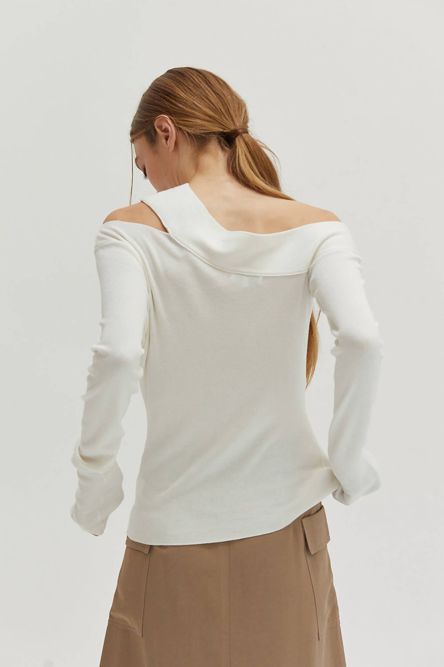 Introducing the Off White One Shoulder Top by CRESCENT, a statement piece with an innovative design. This sweater features long sleeves and a deconstructed neckline with a striking cut-out detail on one shoulder. Crafted from a blend of 70% Viscose and 30% Polyester, this textured piece offers a fit to bodice silhouette with a pull-on closure. Imported with care instructions of hand wash only, this top promises to elevate your wardrobe.