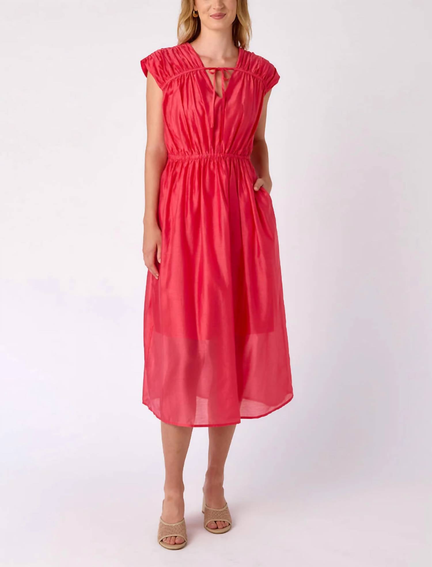 The perfect length dress does exist. Introducing the Emmett Maxi Dress by Crosby by Mollie Burch, an elegant choice for your special occasions. This A-line dress in vibrant Snapdragon features short sleeves and a V-neck with a tie pull waist for a flattering silhouette. Crafted from polyester, it presents a solid pattern and includes functional front pockets for convenience. Closure: Pull-on. Care: Hand wash and line dry.