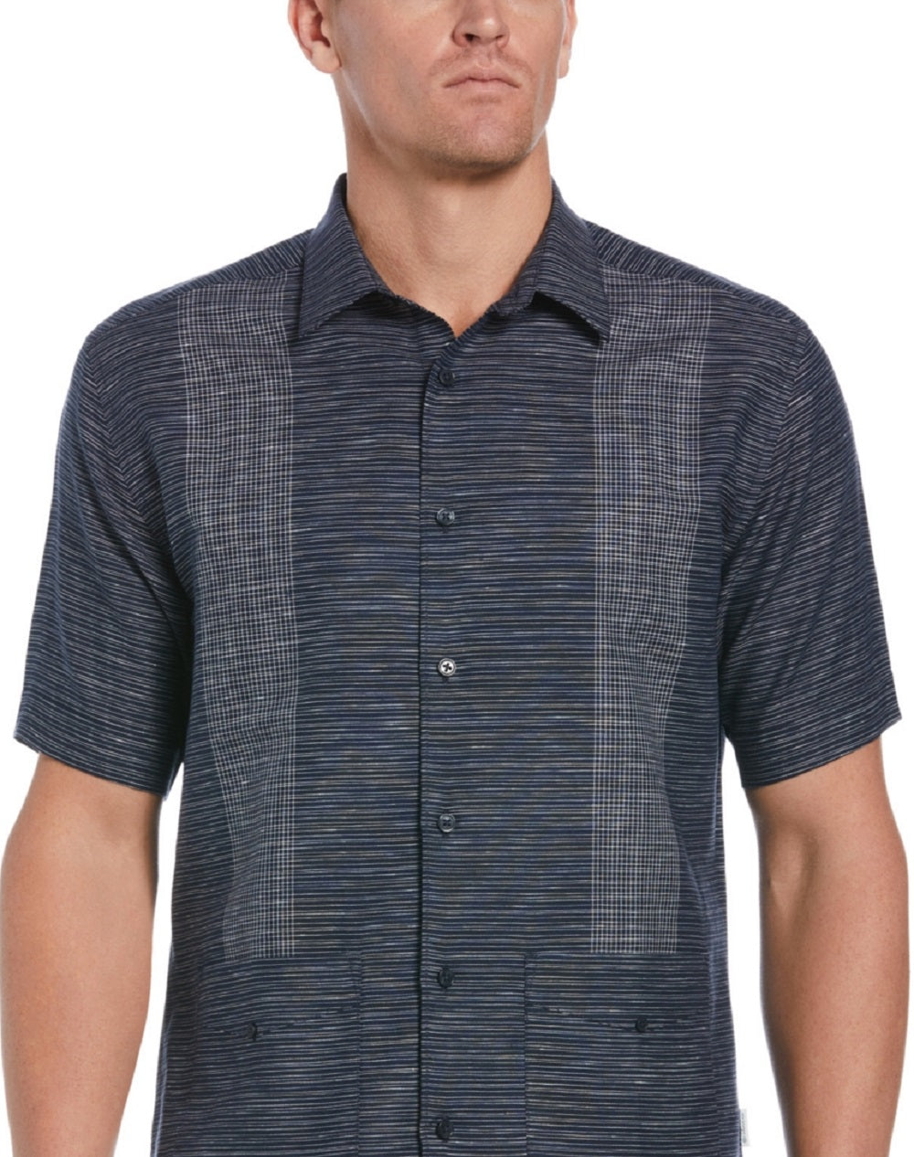 Two bottom pockets add timeless Guayabera style to this short-sleeve button-down shirt from Cubavera. Pair it with a pair of linen pants and your favorite slides for a cool casual look that stands out.| Regular fit| Point collar| Horizontal space dye panels; two bottom pockets| Linen/cotton| Machine washable| Imported