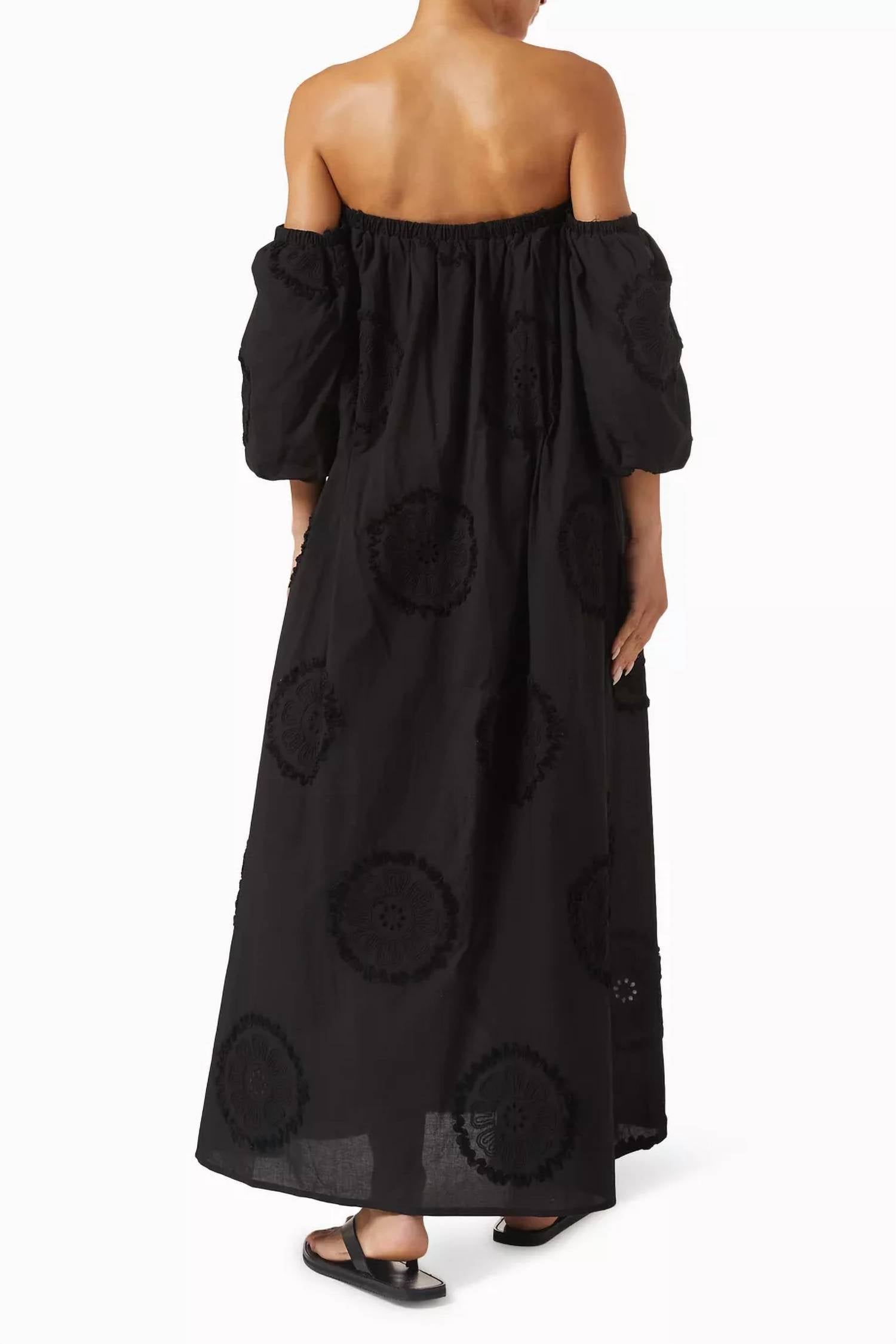 Who doesn't love a good maxi dress? This one you'll be reaching for season after season. Introducing the Florence Floral Maxi Dress by Curaae, a stunning piece crafted from soft, breathable cotton. Designed for effortless elegance, this dress features a shift silhouette, off-the-shoulder neckline, and three-quarter sleeves, all in a textured black pattern. Its flowing design is perfect for beach days and boho chic summer events. Closure: Pull-on. Care instructions: Hand wash.