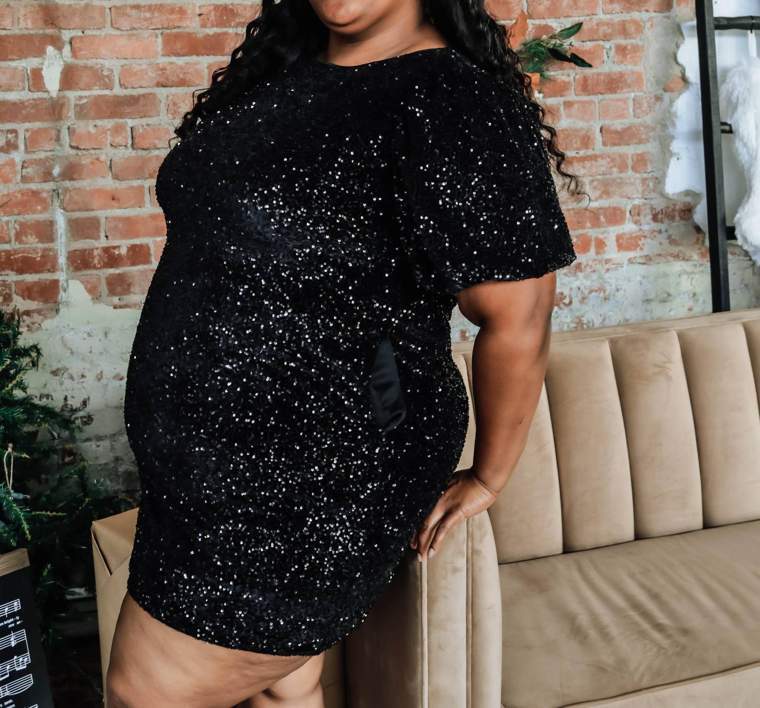 Discover elegance with the Holiday Me Mini Dress Curvy by Curve Market in classic black. This sheath silhouette dress features short sleeves and a flattering crewneck, enhanced by a textured sequin detail for a subtle sparkle that suits any dinner party or New Year's Eve celebration. Crafted for women, this chic mini dress effortlessly blends style with comfort. Perfect for embracing the quiet luxury trend, it’s available in plus sizes, ideal for leaving a memorable impression.