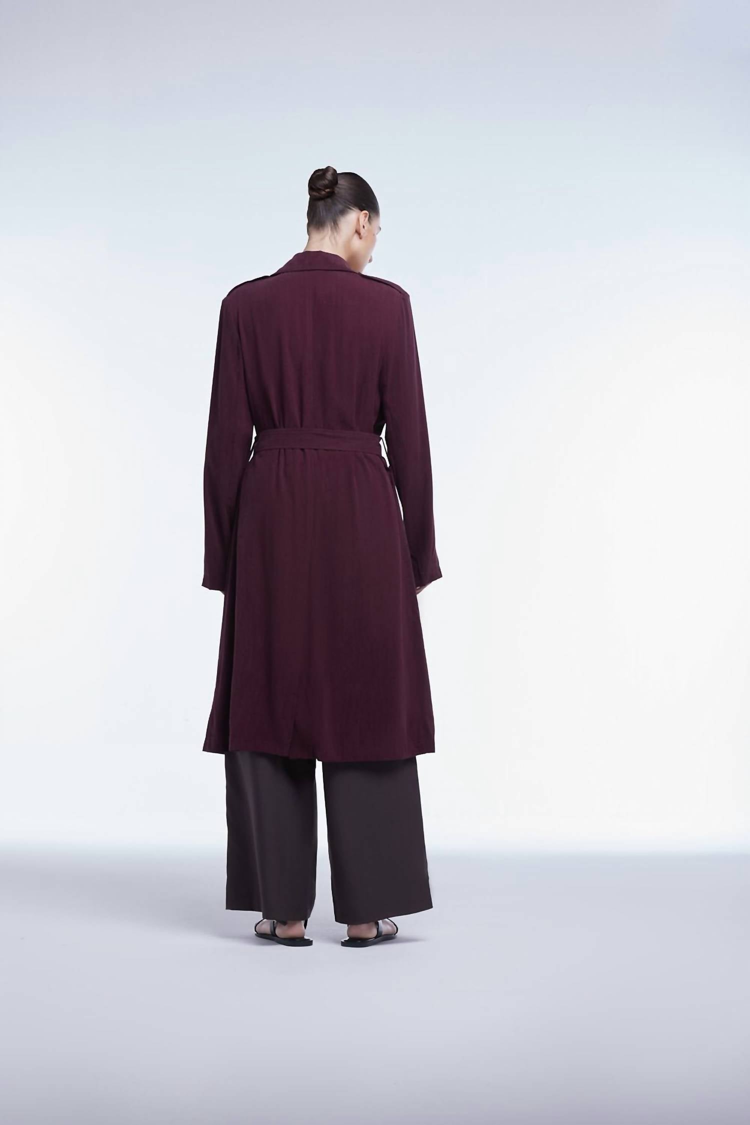 Introducing the Flowy Lapel Trench Coat by Dāl the Label in a rich mulberry shade, perfect for trans-seasonal wear. This long sleeve coat features a relaxed, loose-fitting silhouette with a double-breasted front and a classic pointed collar. Accented with a sleek tie closure and buckle belted waist, it includes practical hip and welt pockets. Originating from PN, this solid-patterned piece requires dry cleaning and is ideal for a spring evening event.
