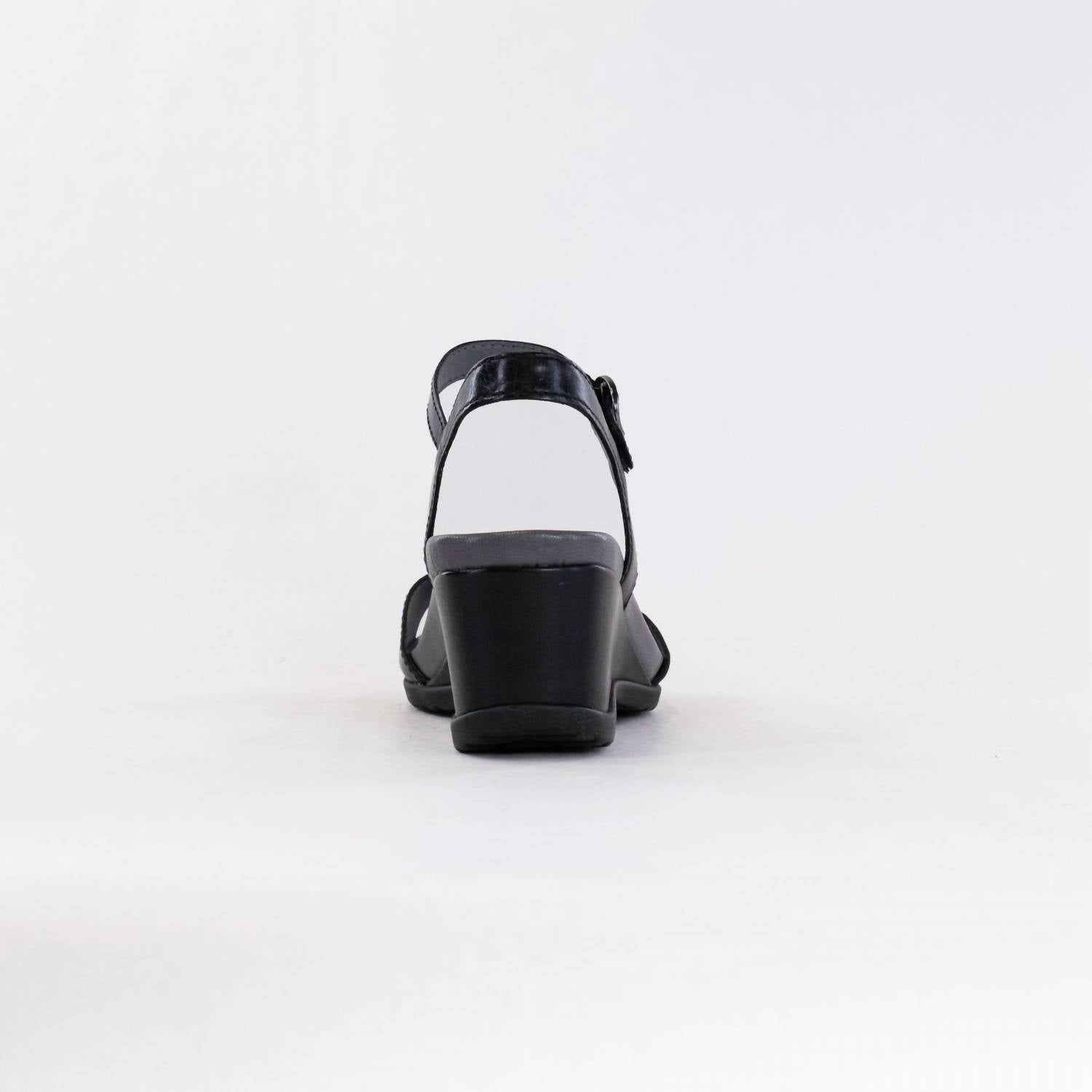 Classicly cute and all-day-wearable. We love this sandal. Step into style with the Women's Dansko Arielle Sandals, where classy black glazed kid leather and a stylish buckle design meet. Crafted with leather uppers and chrome-free leather linings, this wedge-heeled sandal features a full-grain leather-wrapped contoured EVA footbed with memory foam for ultimate comfort. The lightweight BPU wedge and TR rubber outsole ensure durability, while the Arielle boasts a heel height of 2.5 inches and a platform height of 0.75 inches. Recognized with the APMA Seal of Acceptance, these minimalist sandals make a perfect engagement or spring outing companion.