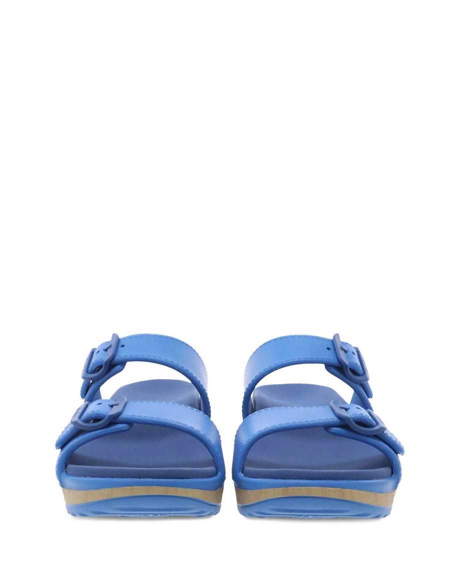 This sandal will take you from brunch to dinner and everything in between. Step into summer with the Women's Kandi Sandal by Dansko, a stylish open-toe sandal in a vibrant Molded Blue color. These sandals feature easy clean uppers and lightweight, molded nylon buckles with the Dansko branding. The I'm Green™ Biobased EVA footbed offers exceptional cushioning and shock absorption, while the Dansko Natural Arch® technology provides enhanced support. With a channeled outsole for added durability and eco-friendly wood grain and exclusive prints, these flat heel sandals are perfect for a boho-chic vacation look.