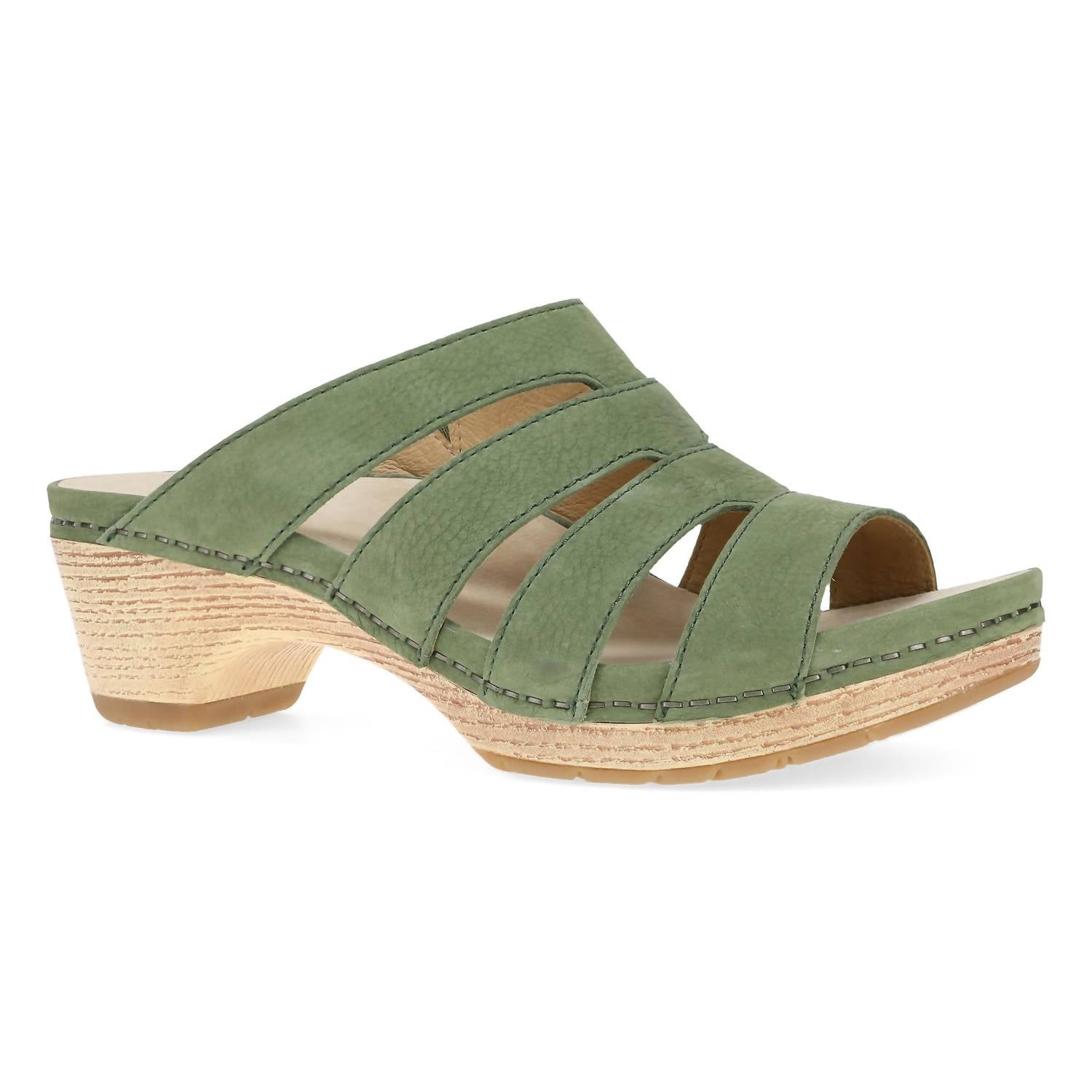 Step into style and comfort with the Women's Lyndi Sandal by Dansko, perfect for your summer vacation in a chic open-toe design. Crafted from high-quality nubuck leather treated with 3M Scotchgard™ for stain resistance, this sandal features a multi-strap slide construction with a synthetic faux-wood block heel height of 2 inches. Its flexible and lightweight TR rubber outsole, along with a lightweight BPU midsole featuring a steel shank, ensures supreme stability and support. The interior boasts a blend of 100% recycled textile and breathable leather linings, with a chrome-free leather socklining treated for odor control.