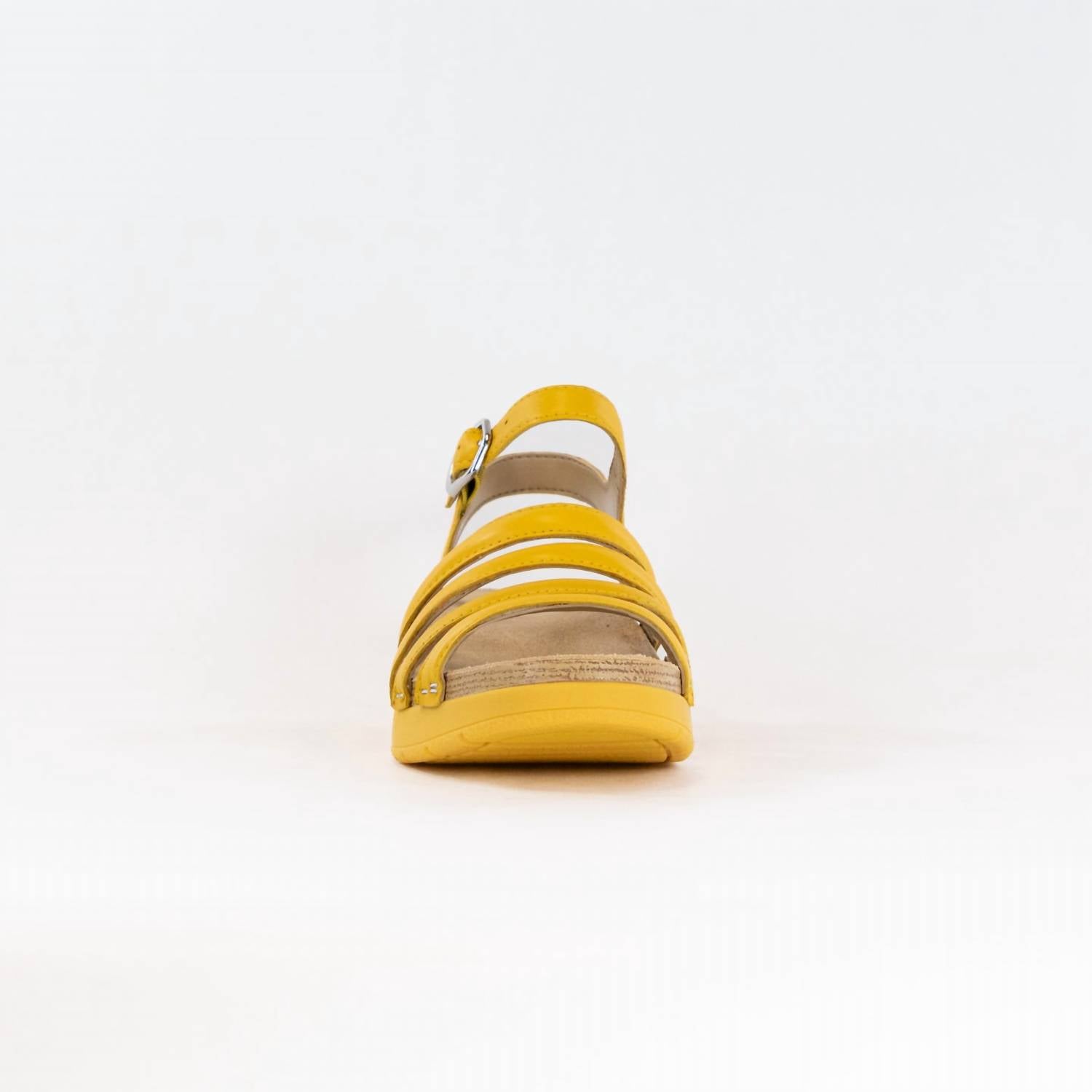 Step into summer style with Dansko's Women's Roxie Sandal in a vibrant yellow hue. Crafted from high-quality leather, this sandal features simple straps that make it perfect for showcasing your style during vacations or special occasions like Easter. Built for comfort with a patented stapled construction, it includes soft linings and a chrome-free suede socklining for an all-day wear experience. The sandal boasts a cushioned energy-return PU footbed and a midsole of contoured BPU, finished with a flexible TR rubber outsole to ensure lightweight, comfortable steps.