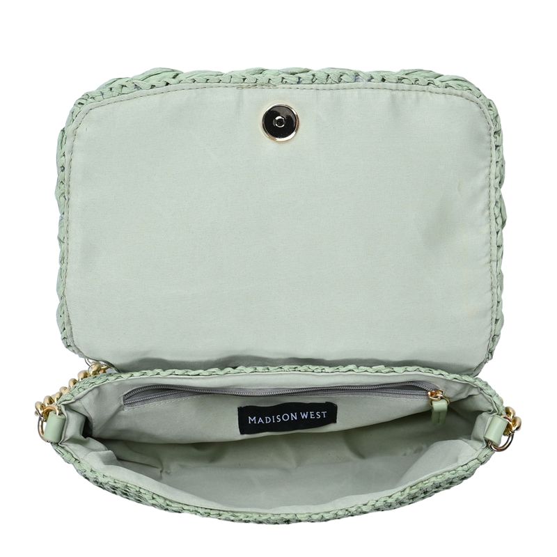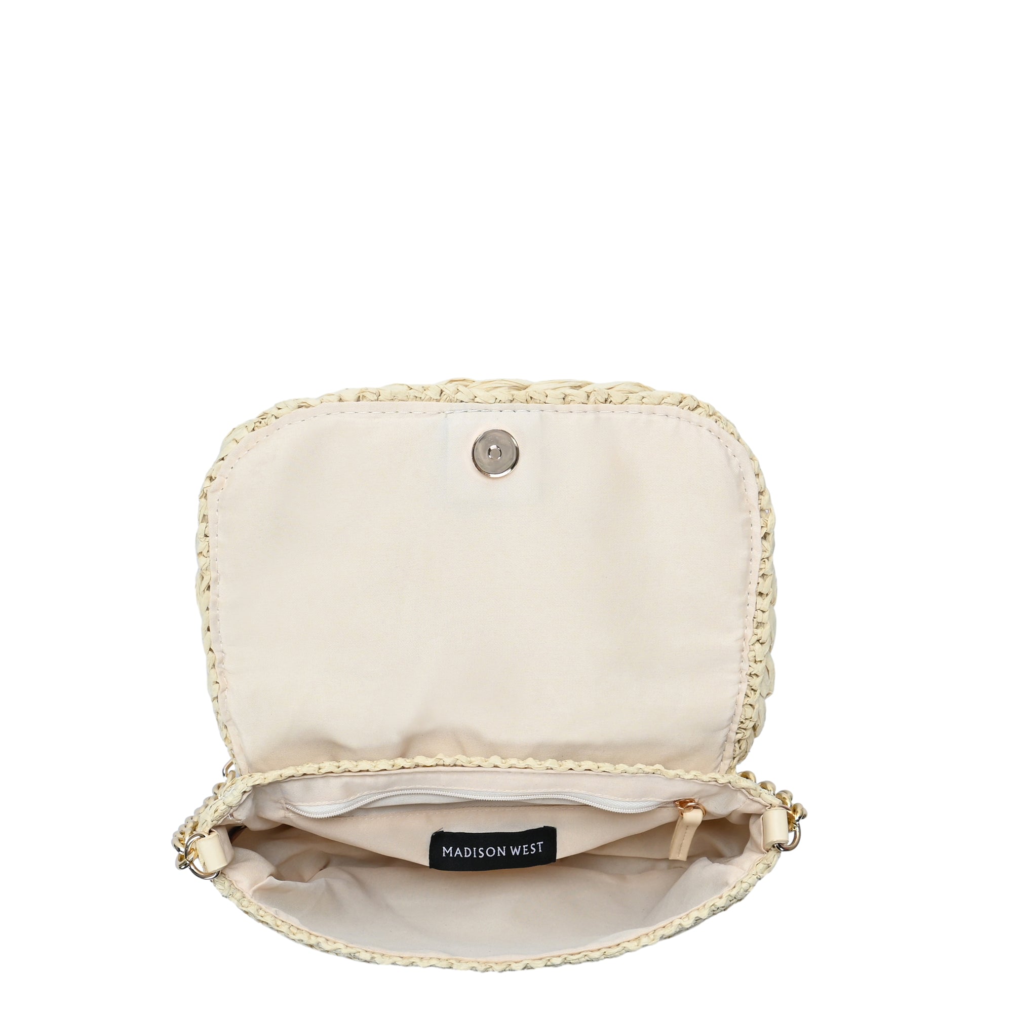 The Darya Straw Shoulder Bag combines effortless elegance with everyday ease. Designed with a braided straw texture and accented by a light gold chain shoulder strap, this bag features a secure flap with snap button closure and an interior zipper pocket for added functionality.