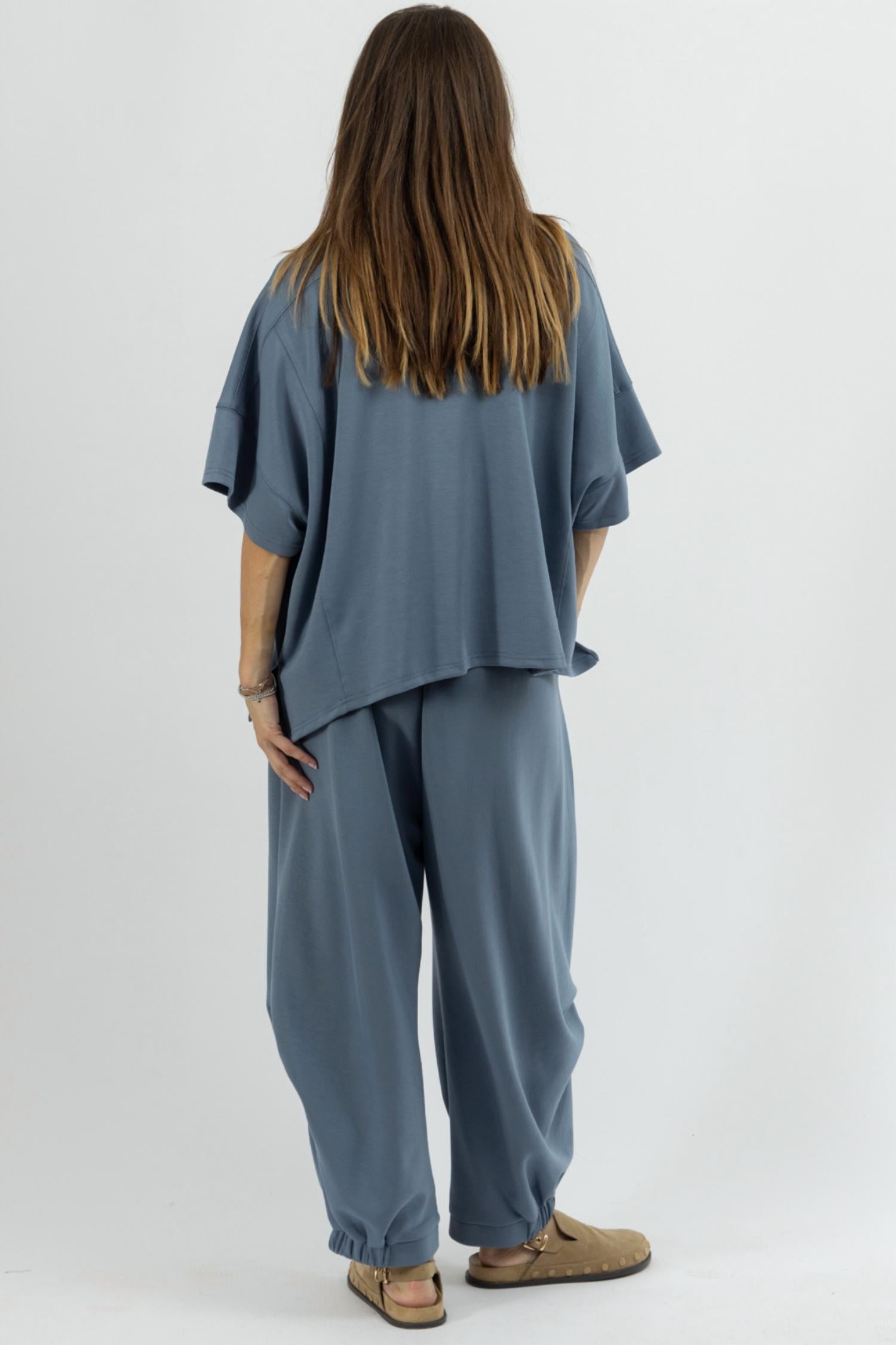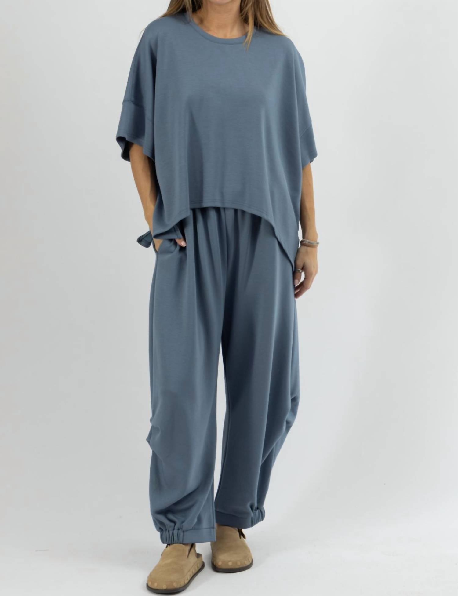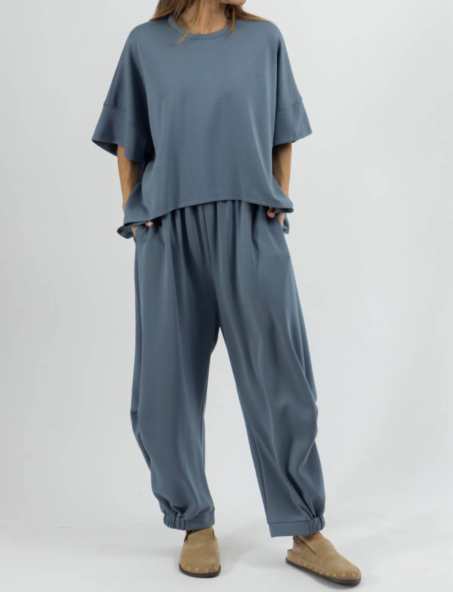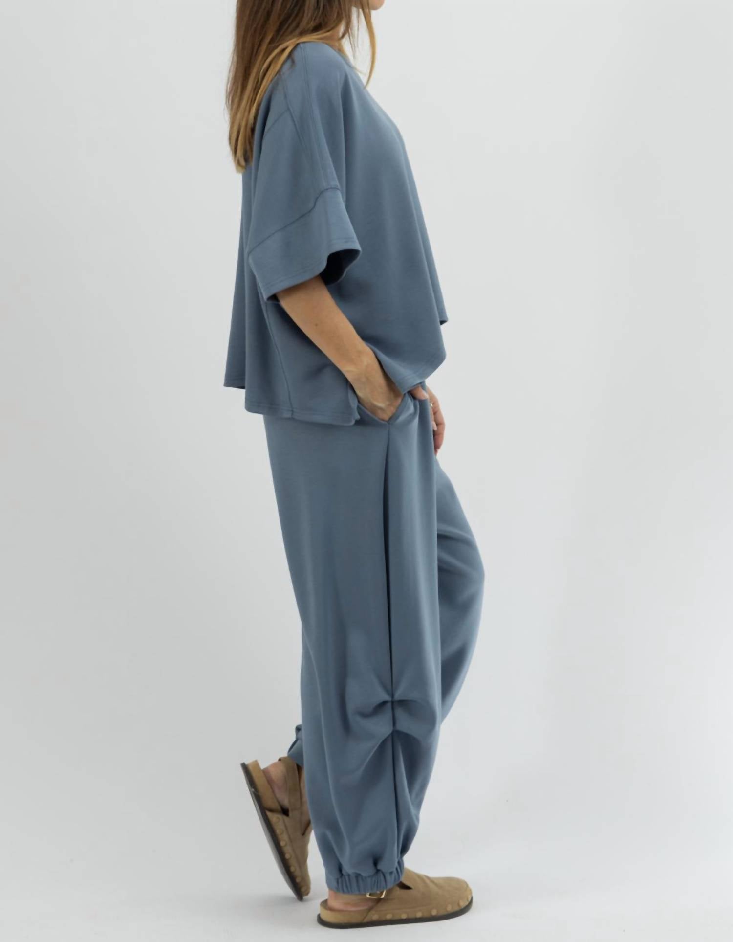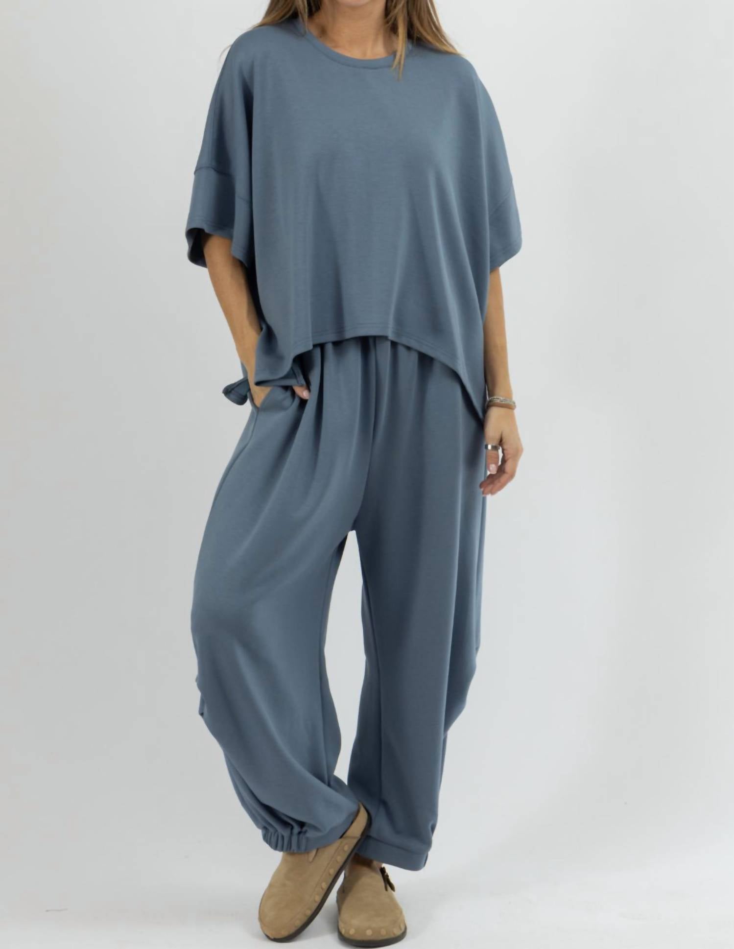 Discover the Gotta Have It Set by Davi & Dani, perfect for relaxed comfort in your loungewear collection. This beige set features a crewneck with a drop shoulder design and short sleeves, crafted from a blend of 50% Rayon, 45% Polyester, and 5% Spandex. Enjoy its elastic waist, banded ankles, and convenient side pockets. Model is wearing a size small, standing at 5'8" with dress size 2.