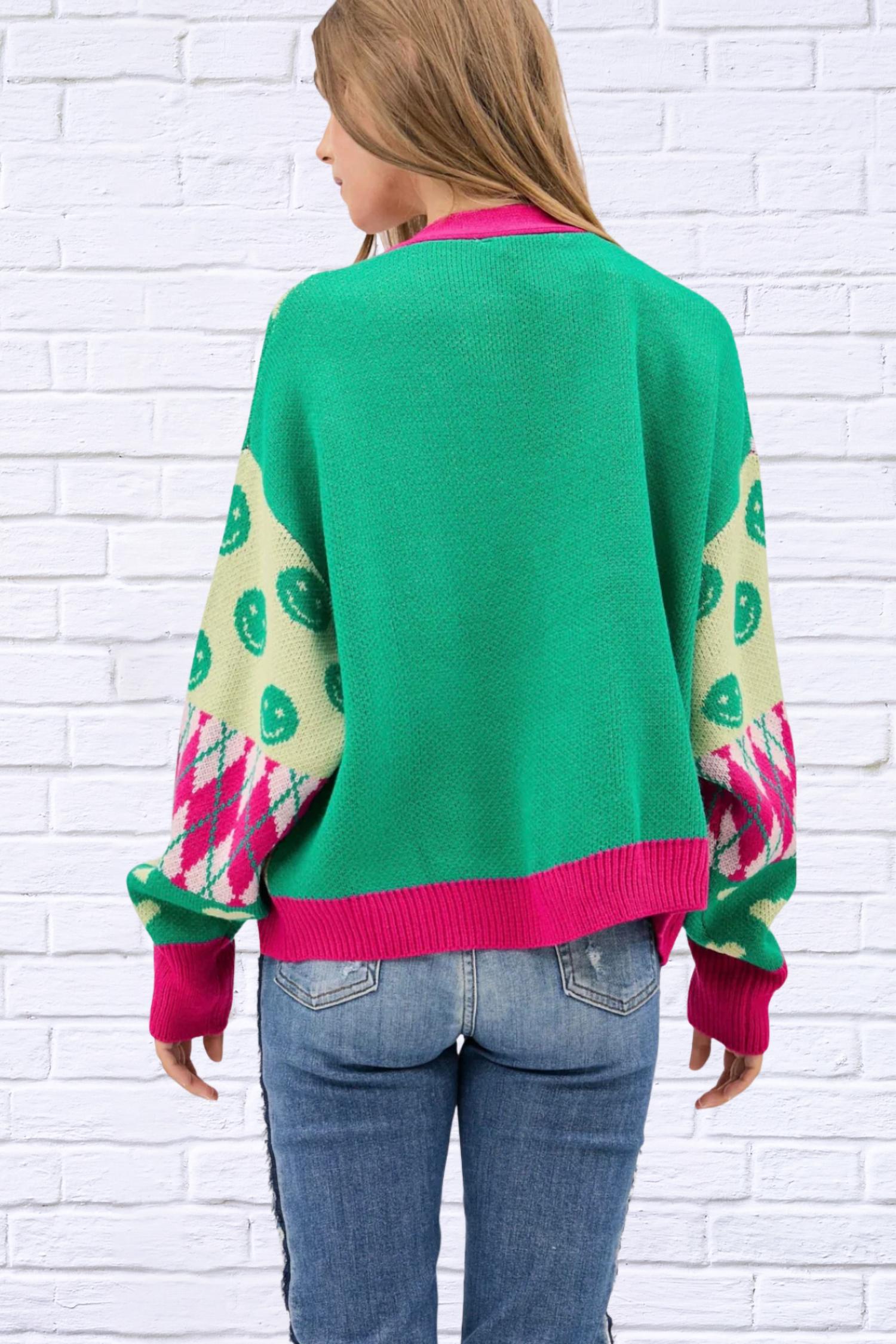 A classic fit that works just as good buttoned as it does left open. Introducing the V-neck Drop Shoulder Pattern Sweater by DAVI & DANI, a vibrant must-have for any occasion. This cardigan features long sleeves and a playful multi-pattern design in bright colors with fun emojis, hearts, little flowers, and edgy checkers. Made from 100% acrylic, it offers a loose fit that runs slightly large. Button closure. Hand wash cold, lay flat to dry, do not dry clean, bleach, iron, or tumble dry.