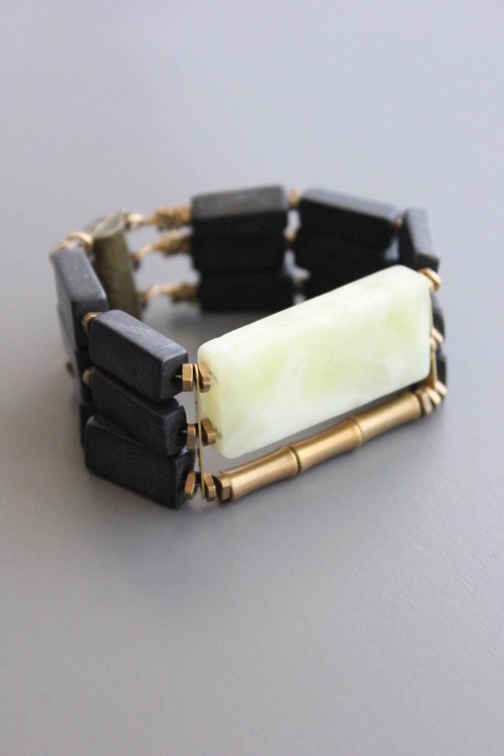 This bracelet will be your favorite go-to piece of the season. Discover the exquisite Women's Jade Bracelet by David Aubrey Jewelry, a stunning three-strand piece featuring black stones, brass accents, and jade. Handcrafted with care in a New Jersey studio, this bracelet includes a secure magnetic clasp. Made from mixed metal, its plated brass components should be gently cared for by wiping with a soft cloth and avoiding lotions, perfumes, and water exposure. Each piece is made to order, celebrating the unique variations in stone shape, size, and color.