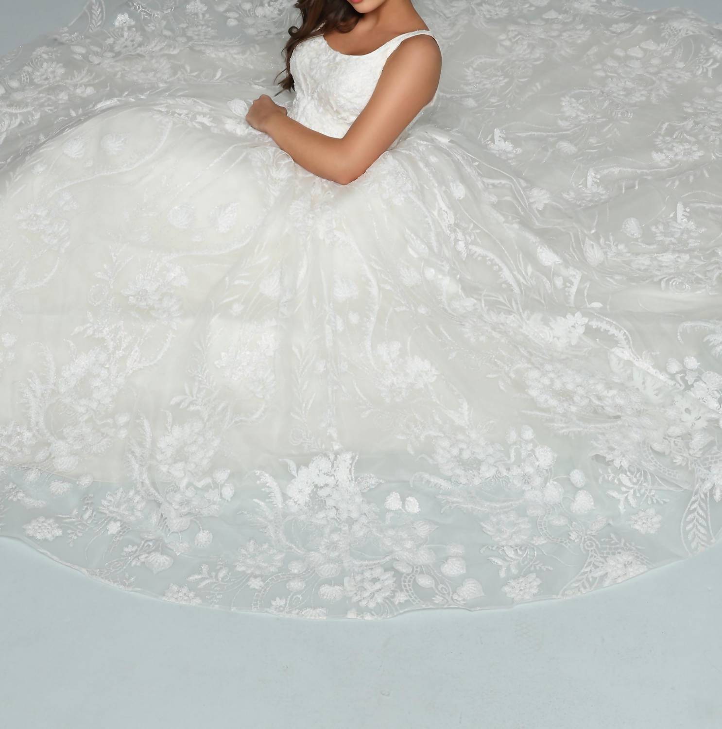 Designed for the bride who values understated elegance. Its classic design and perfect fit make it the ideal choice for your special day. Say yes to the dress! Introducing the Glitter Tulle Ball Gown by DaVinci Bridal, an exquisite choice for your special day. This stunning wedding dress features a sleeveless design crafted from a blend of glitter tulle and tulle, creating an enchanting A-line silhouette. With its zip closure, the gown is detailed with beaded lace appliques, sequins, and a chapel train, ensuring a fairytale appearance. Available in elegant ivory tones, the gown's square neckline and V-back complete the timeless elegance, while pockets offer practical yet discreet storage.