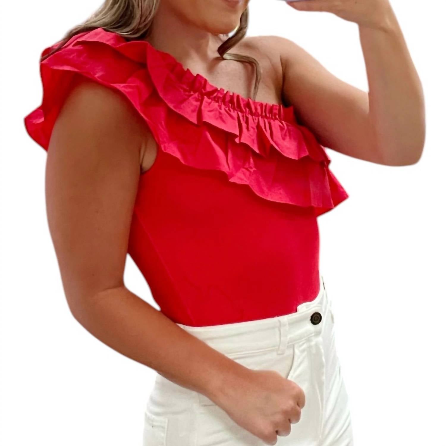 Pair this number with your favorite high-waisted jeans. Step onto the scene with the Life Of The Party Bodysuit by Day + Moon in vibrant Candy Red, crafted to elevate your evening elegance. This striking sleeveless piece features a one-shoulder neckline adorned with playful ruffles, ensuring you stand out in any crowd. The solid, ribbed material provides a flattering fit, perfect for spring occasions or festive Christmas celebrations. Designed without pockets, this monochrome bodysuit is your go-to for vacations and parties where you aim to shine.