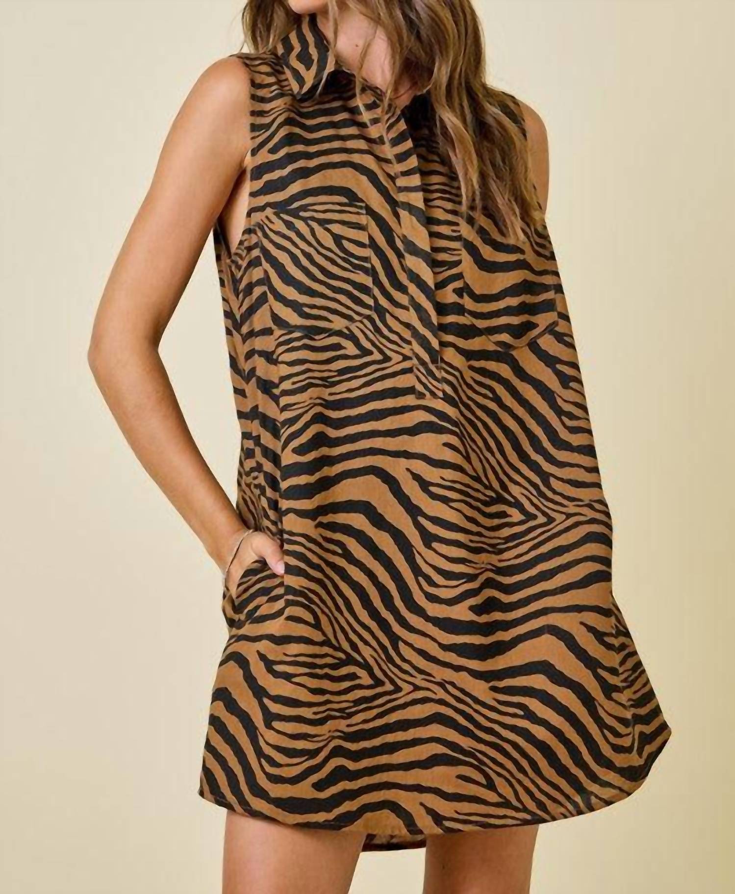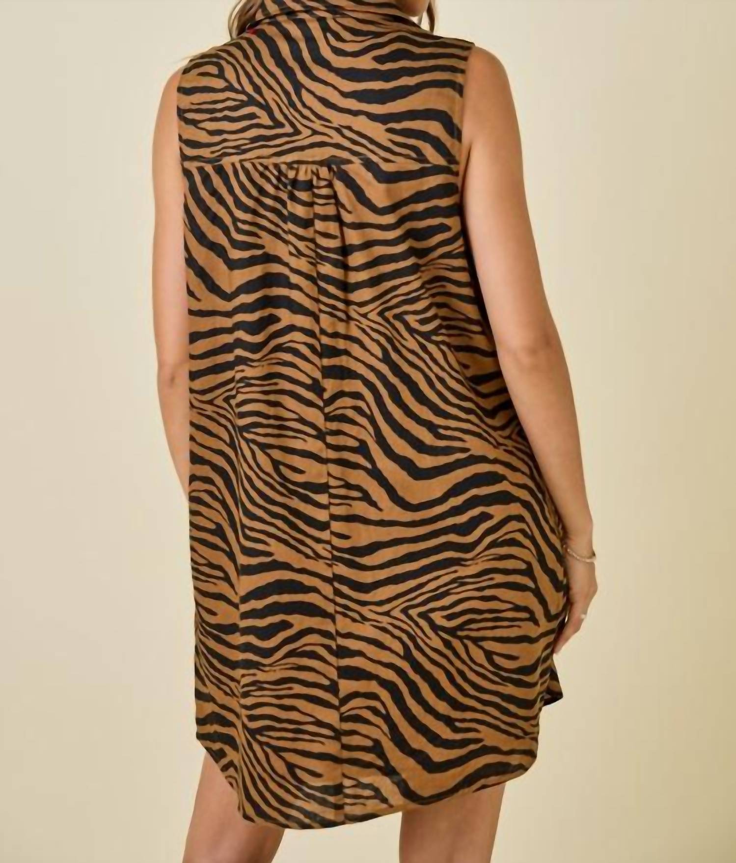 Just add slides or mules and you are good to go. Introducing the Petrie Dress by day + moon, a striking midi in a bold tiger print perfect for a summer vacation. This sleeveless shift dress features a classic collar and is crafted from a luxurious linen blend with functional pockets for added convenience. Designed without a closure, it offers a comfortable, pull-on style. Please follow the garment's care instructions for optimal longevity.