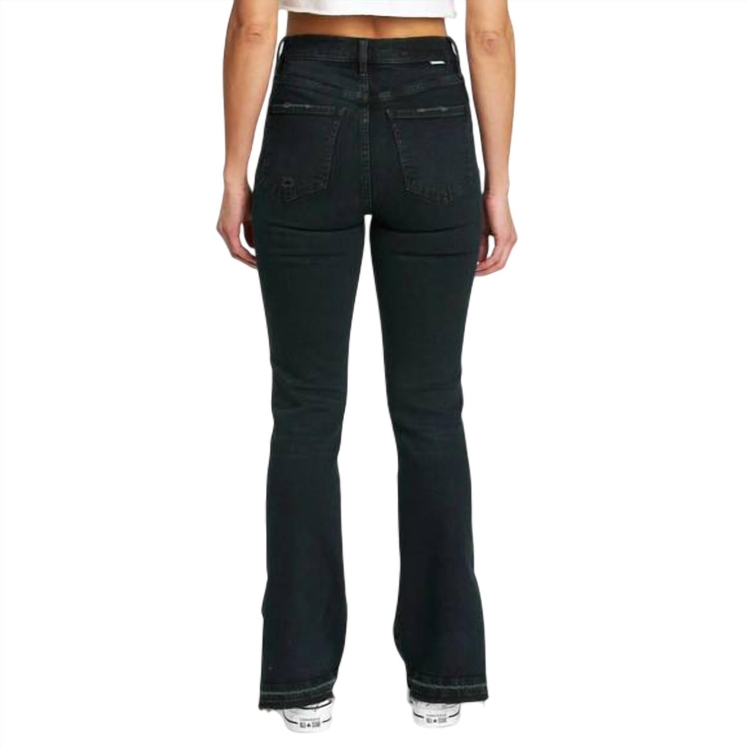 Introducing DAZE's Go-Getter Hi-Rise Side Slit Flare Jeans in the distinctive Late Text color, blending modern flair with a vintage vibe. With a slim high-rise fit and flared leg style, these jeans offer a stylish silhouette featuring a comfortable 32" inseam and 19 1/2" leg opening. Composition is 99% cotton and 1% spandex crafted from our 11oz Just Right Denim, providing a perfect balance of rigid and stretch. Closure: Zip closure. Care: Machine wash cold.