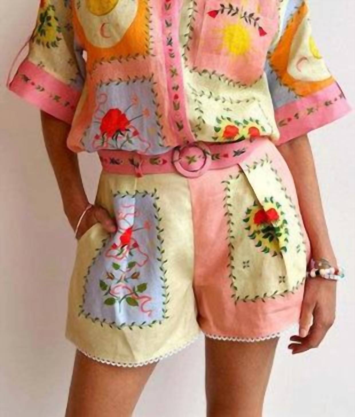 Loungewear doesn't have to be frumpy and this is exactly what we had in mind. Designed for a comfortable fit, this chic little number will be your favorite lounging-at-home look. Embrace playful style with the Patchwork Print Short Sleeve Shirt and Shorts Set by De Vave, perfect for your summer wardrobe. This vibrant loungewear set features a coordinated patchwork design crafted from a blend of 65% linen and 35% polyester, offering lightweight comfort. The shirt is complete with a button-up closure and a matching belt for the shorts, ideal for vacation-ready style. Care for this multi-colored maximalist set is simple with machine washing instructions.