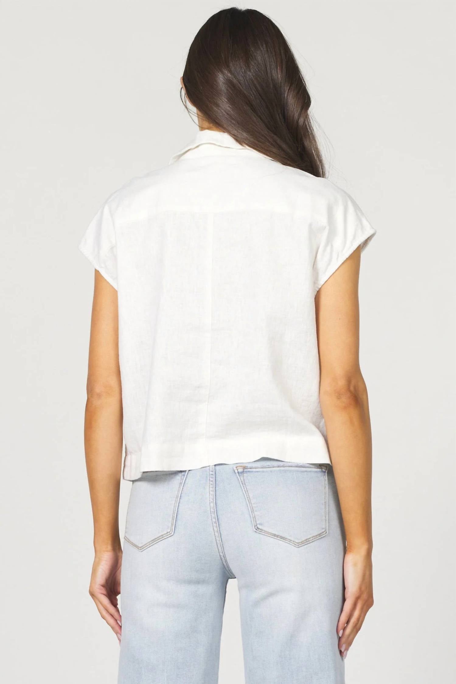 A classic button down shirt that will never go out of style. Introducing the Cruz Button Down Shirt by DEAR JOHN DENIM, offering a blend of breathable comfort and timeless style in a linen-cotton composition. This short-sleeve shirt features a collar and button-down design, perfect for a relaxed fit with a sophisticated touch. The shorter length makes it versatile for women's fashion, transitioning from casual daytime to elegant evenings in classic white. Care instructions include machine wash cold, gentle cycle, with like colors, hang dry, and warm iron if needed.