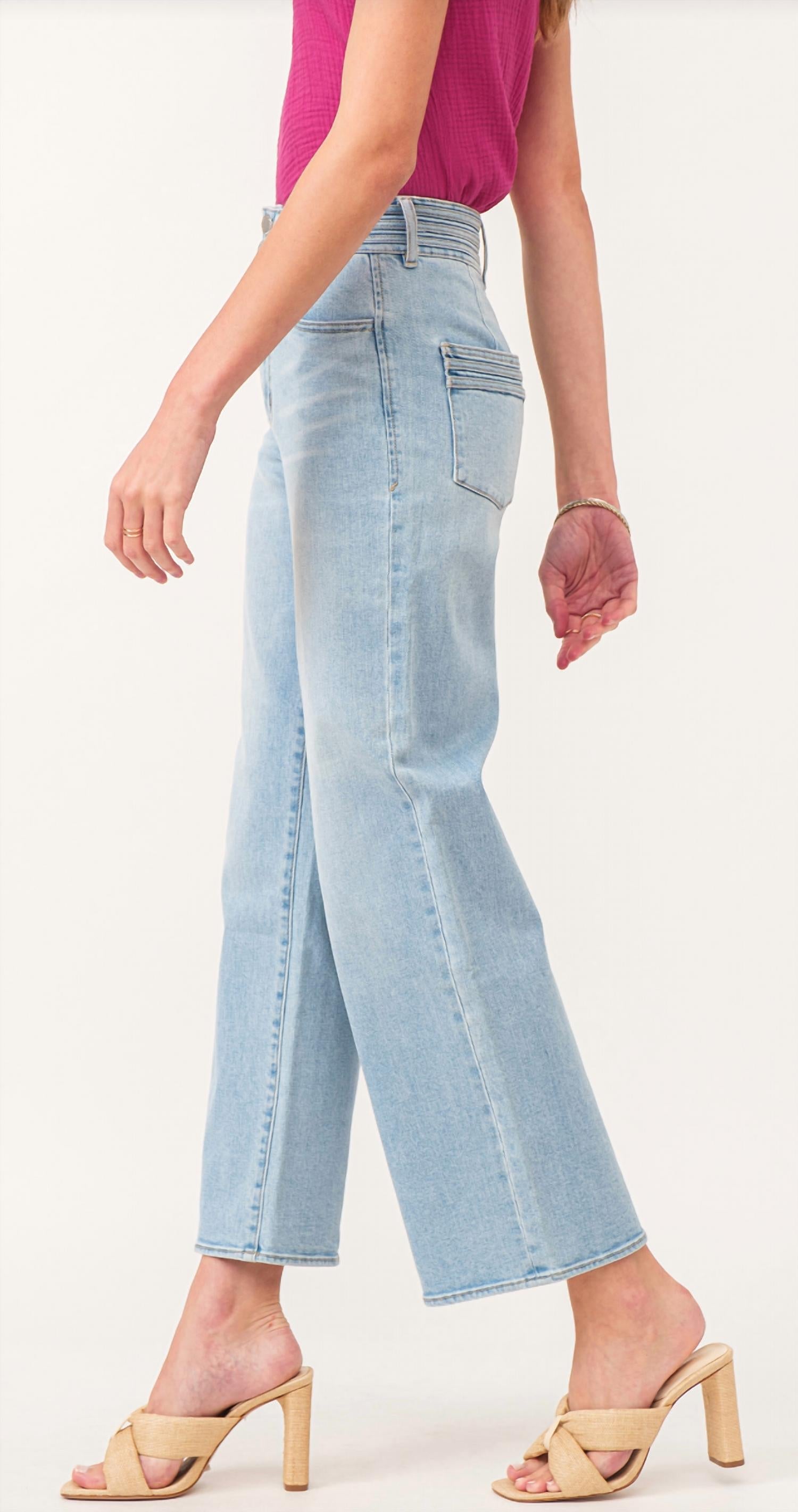 This classic straight leg jean has a perfect fit and goes with just about everything. Introducing the Holly High Straight Leg Jean by DEAR JOHN DENIM, a must-have for any fashion-forward wardrobe. These women's jeans in a versatile Austin light wash feature a high-rise waist and a relaxed straight leg fit. Crafted from 98.6% cotton and 1.4% spandex, they offer comfort while maintaining a chic look with their clean hem. Closure: Zip closure. Care: Machine wash and tumble dry. Dimensions include a 12" front rise, 14.5" back rise, 19.5" leg opening, and 30" inseam. Perfect for streetwear or any special occasion like Mother's Day or an anniversary.