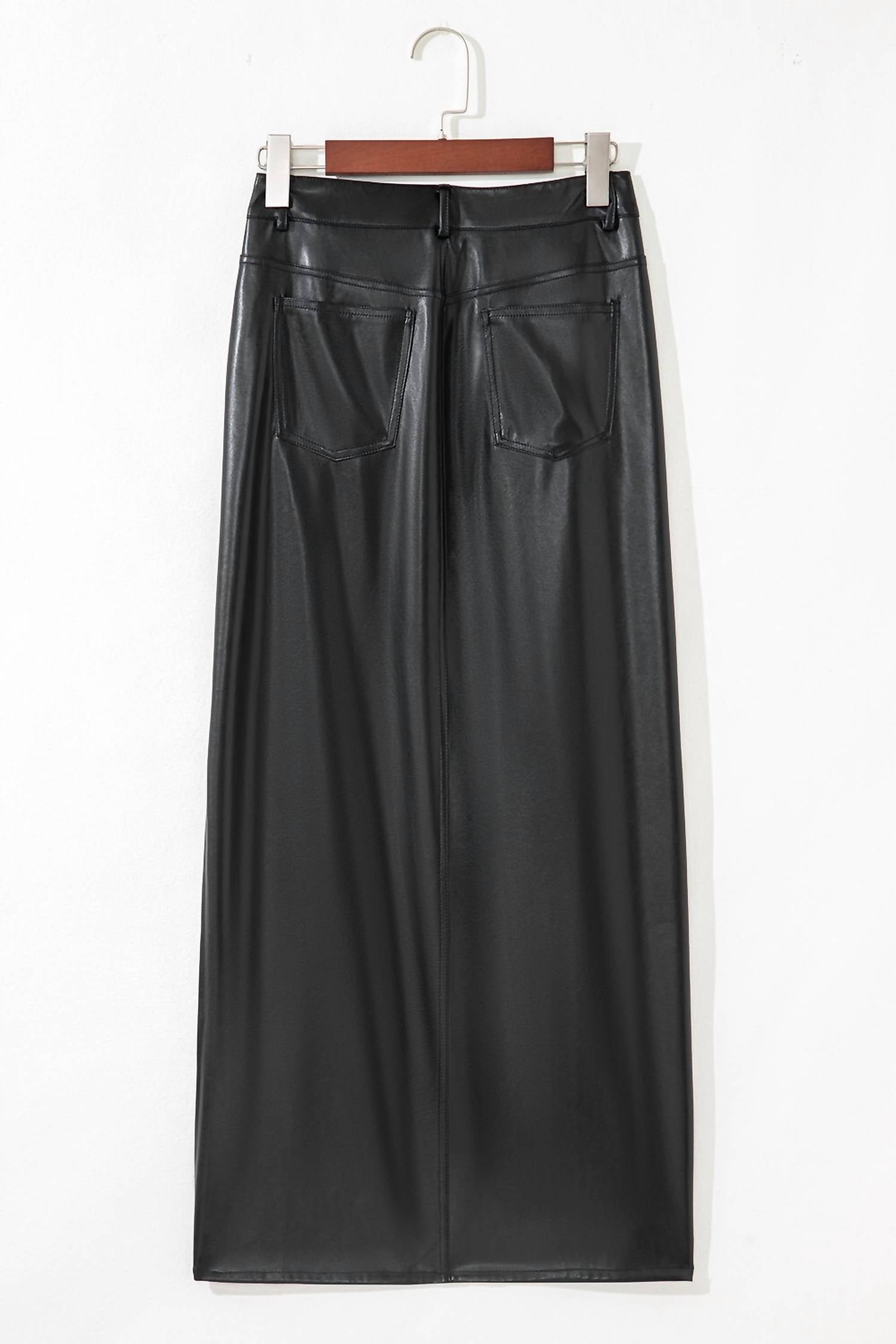 This asymmetrical skirt will take you from desk to dinner. Black Faux Leather Side Slit Maxi Skirt Material: 100% Faux Leather