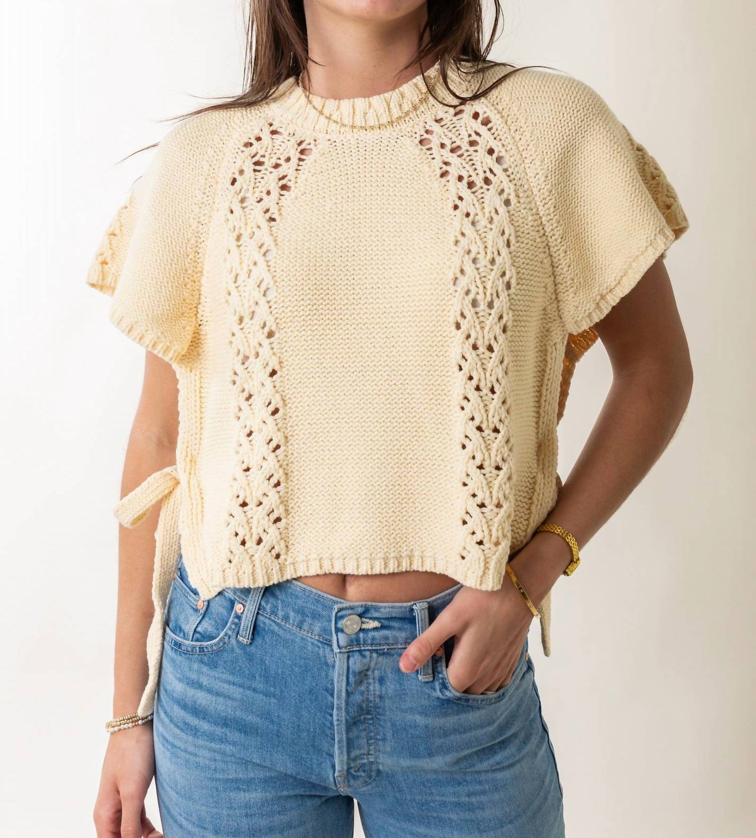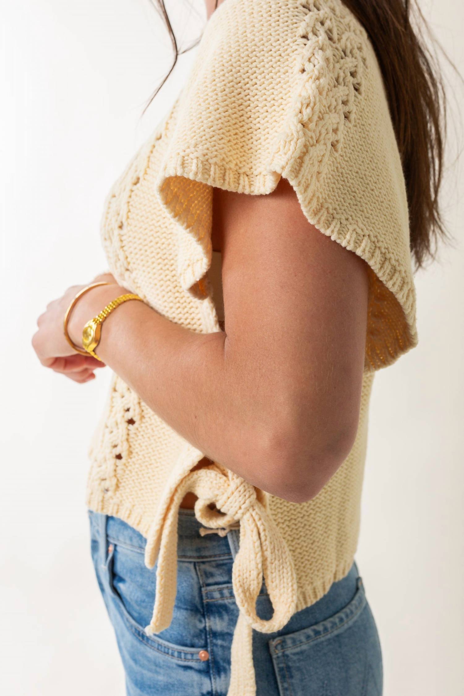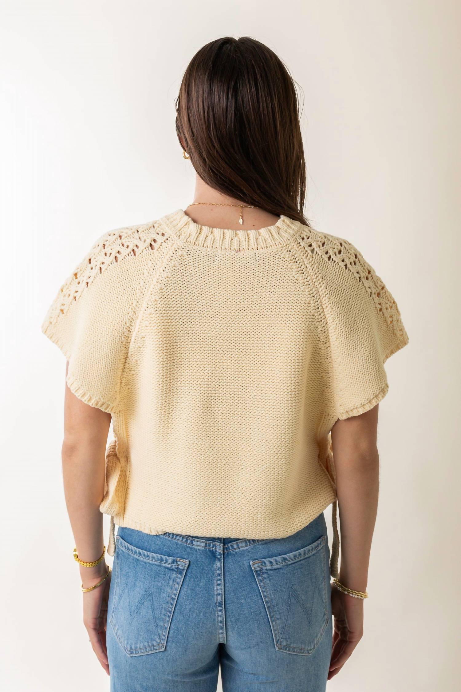 A versatile blouse that works from desk to dinner! Introducing the Dinis Knit Top by DELUC, a cap sleeve sensation in stylish ecru for everyday wear. Crafted from a comfortable cotton blend, this textured blouse features playful open sides with trendy side ties. Composition: 60% Cotton, 40% Acrylic. Closure: Pull on. Care: Hand wash or dry clean. Measurements for size X-Small: Chest - 17 in., Length - 17.5 in.