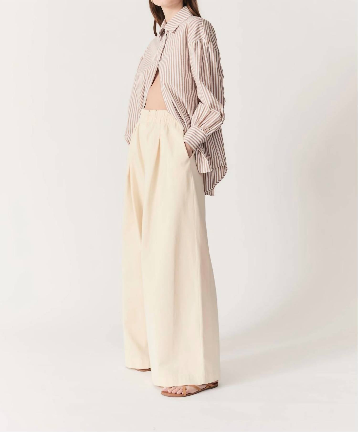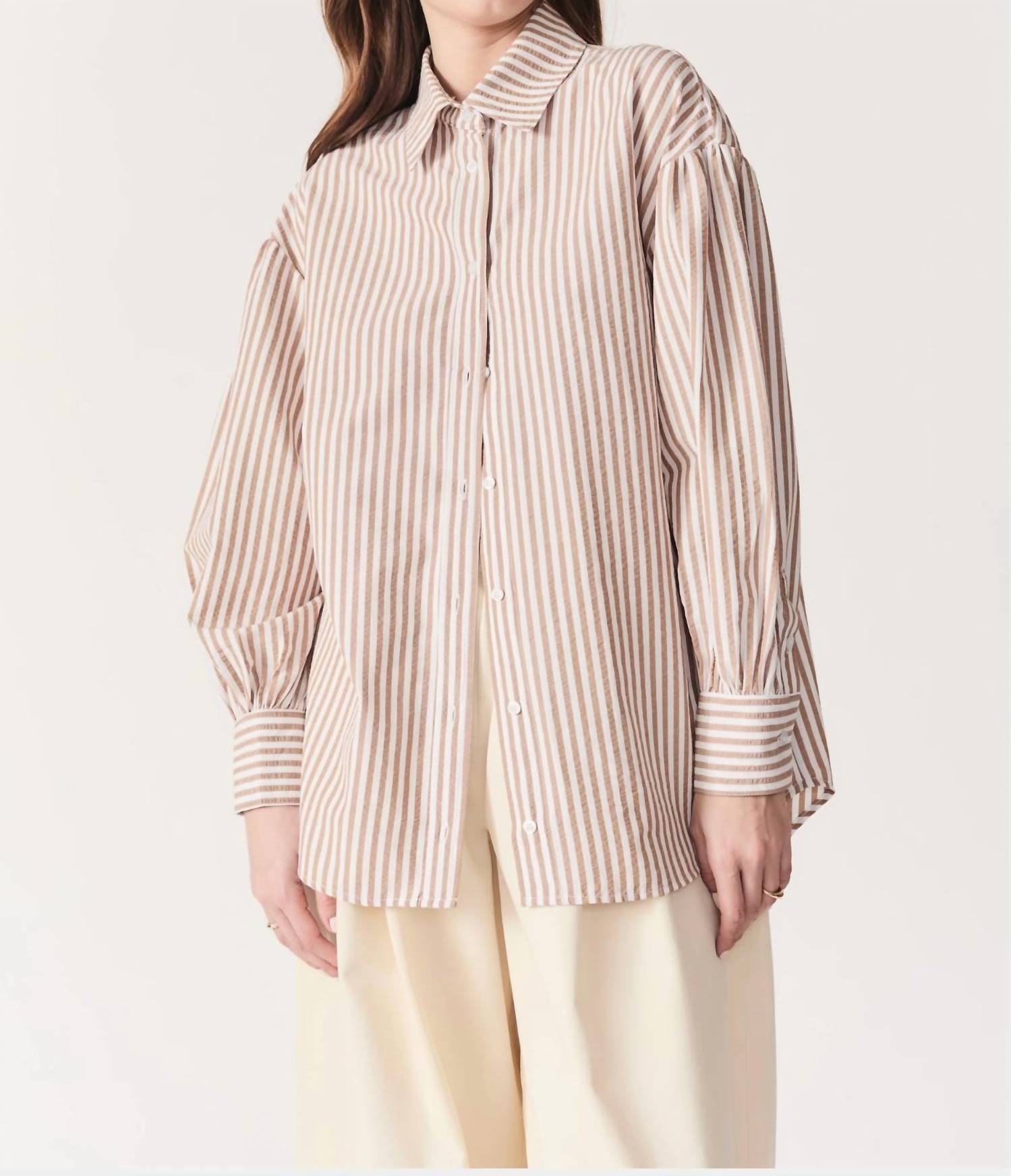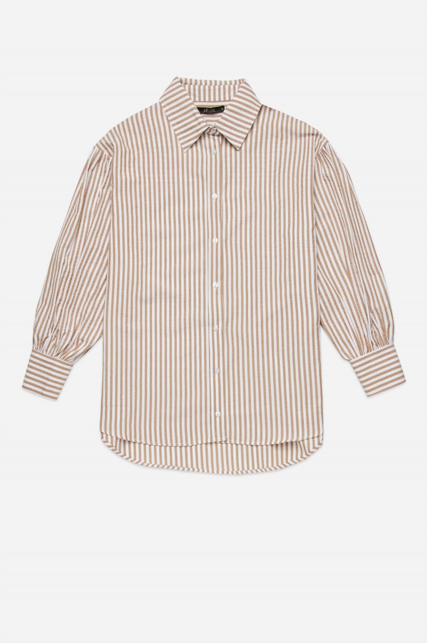 A classic button down shirt that will never go out of style. Experience the effortless style of the Felicity Oversized Striped Button Down Shirt by DELUC, crafted for a relaxed and comfortable fit. Designed with long puff sleeves and a stylish lapel collar, this light blue shirt features a front button closure, adding a touch of elegance. Material: Polycotton gingham (cotton blend). The shirt is designed longer at the back for an updated silhouette, making it a versatile addition to your wardrobe.