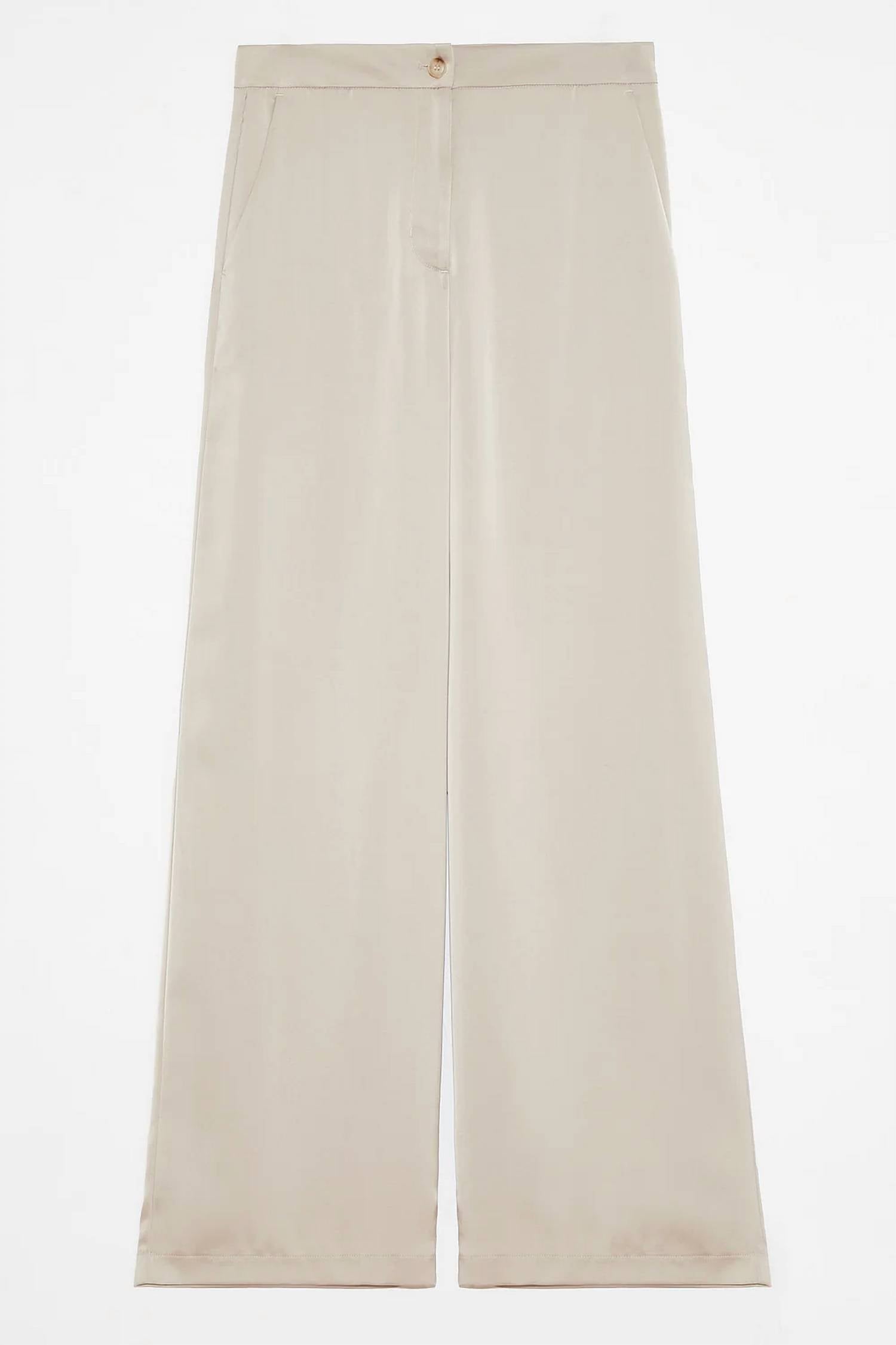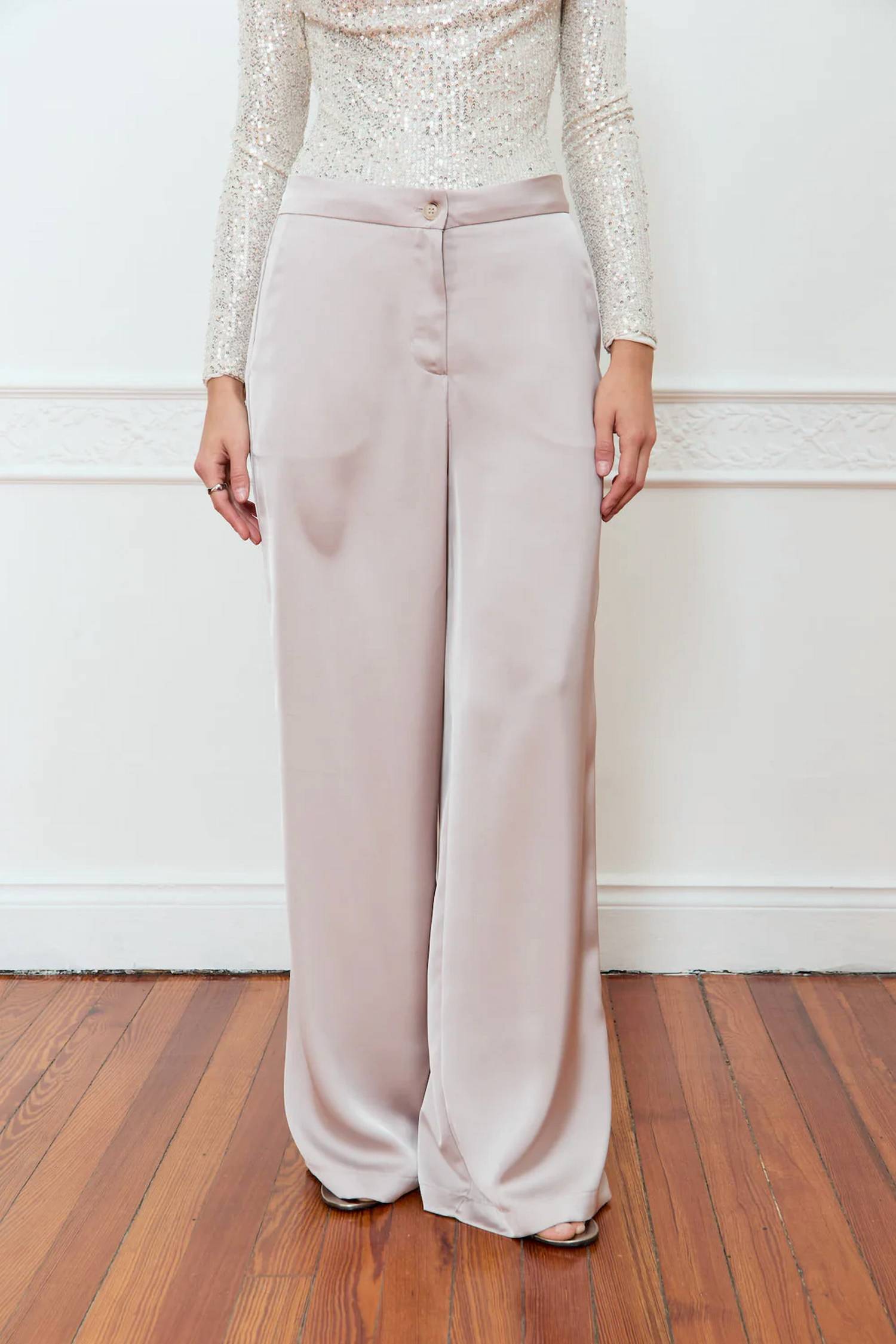 Designed for a sophisticated, silky smooth look in a stunning Pearl hue. Crafted with a wide leg and relaxed fit. Deliver both style and comfort with their luxurious satin material. High-rise design and button closure create a sleek silhouette. Dry clean only.