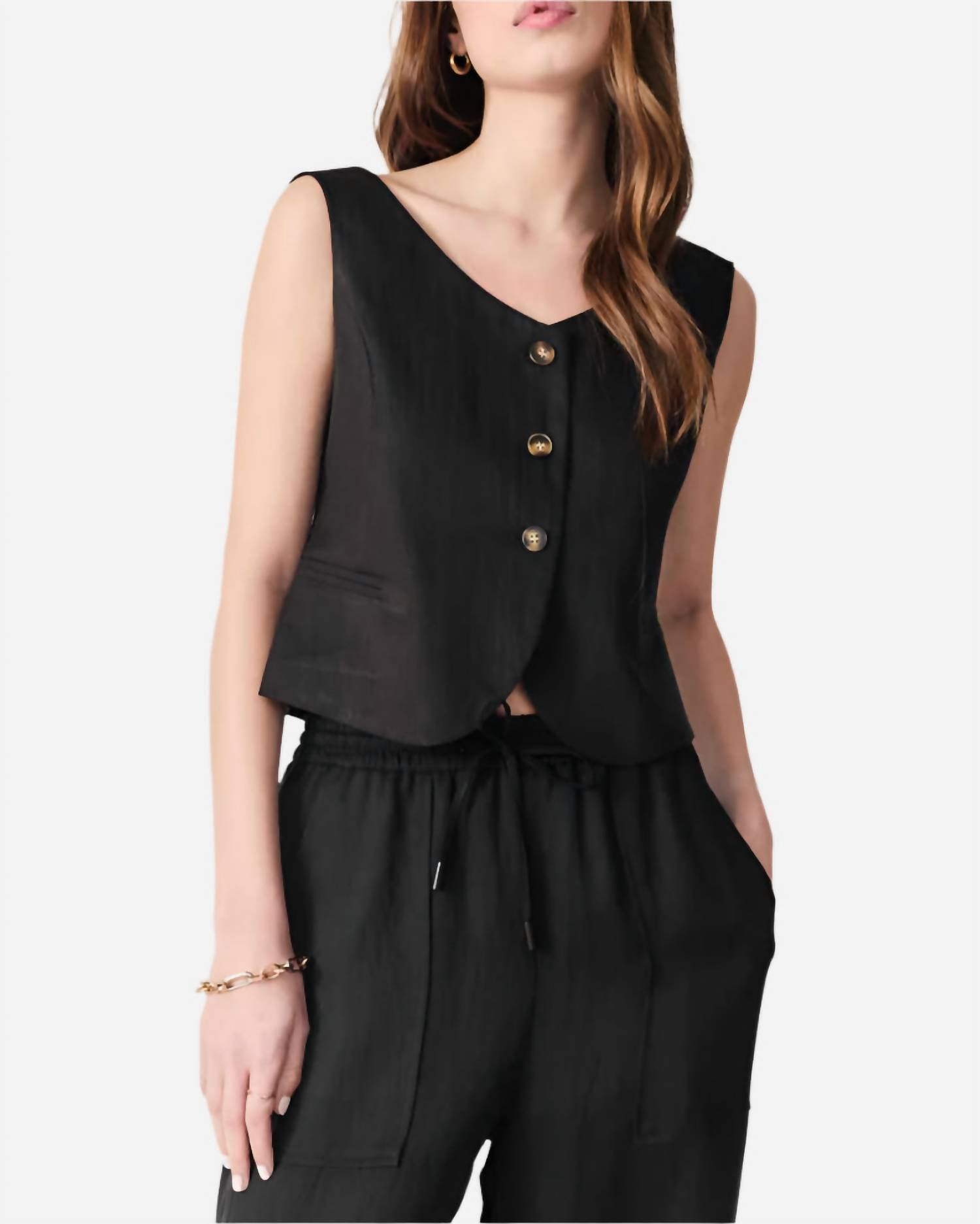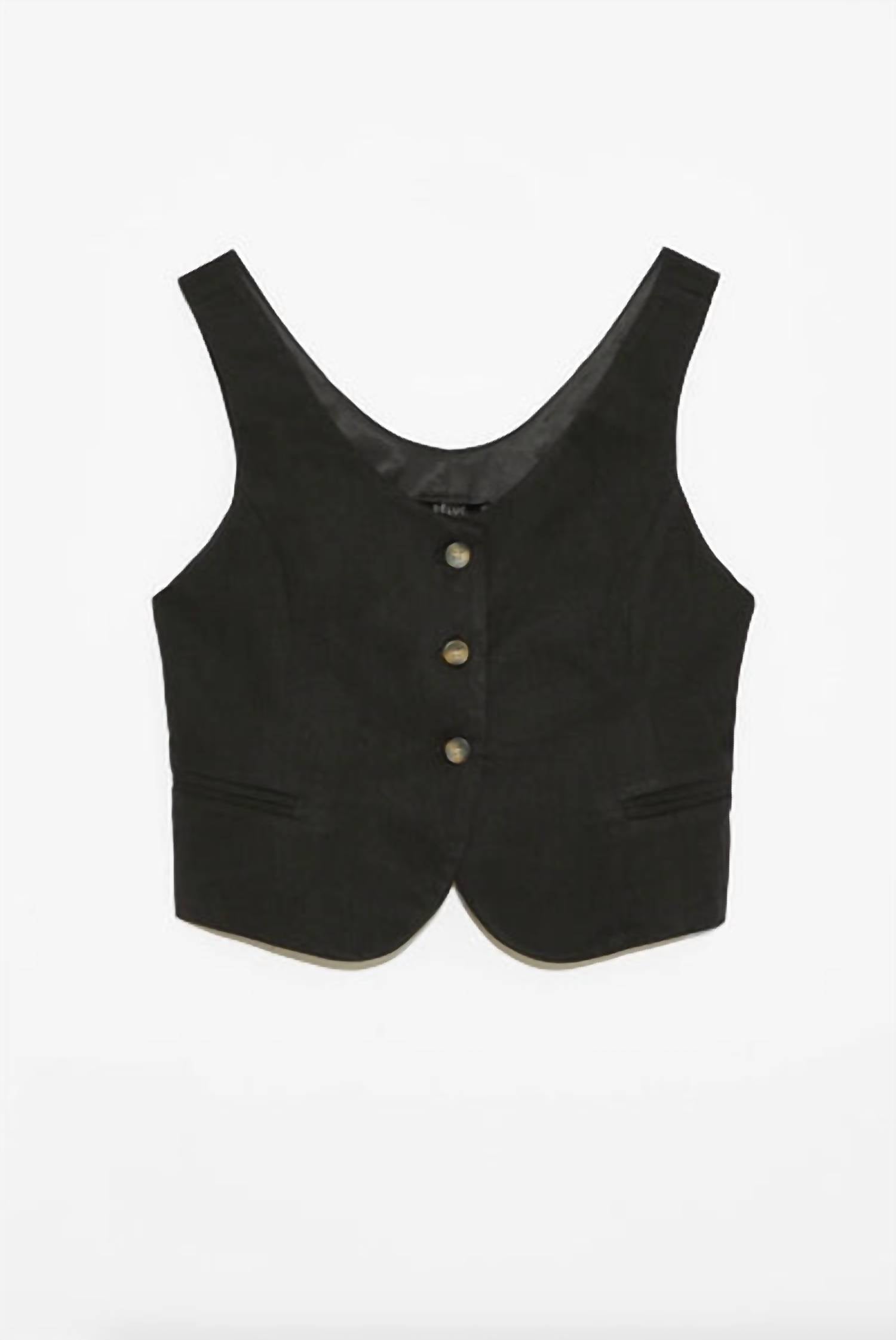 Throw this vest over an all black outfit for a perfectly polished look. Designed with a sleeveless silhouette and an elegant U neckline, this vest features front marbled buttons for closure and fake welt pockets for a sleek look. Composition: 64% Tencel, 30% Viscose, 6% Polyamide, complemented by a fully lined interior for added comfort. Dry clean.