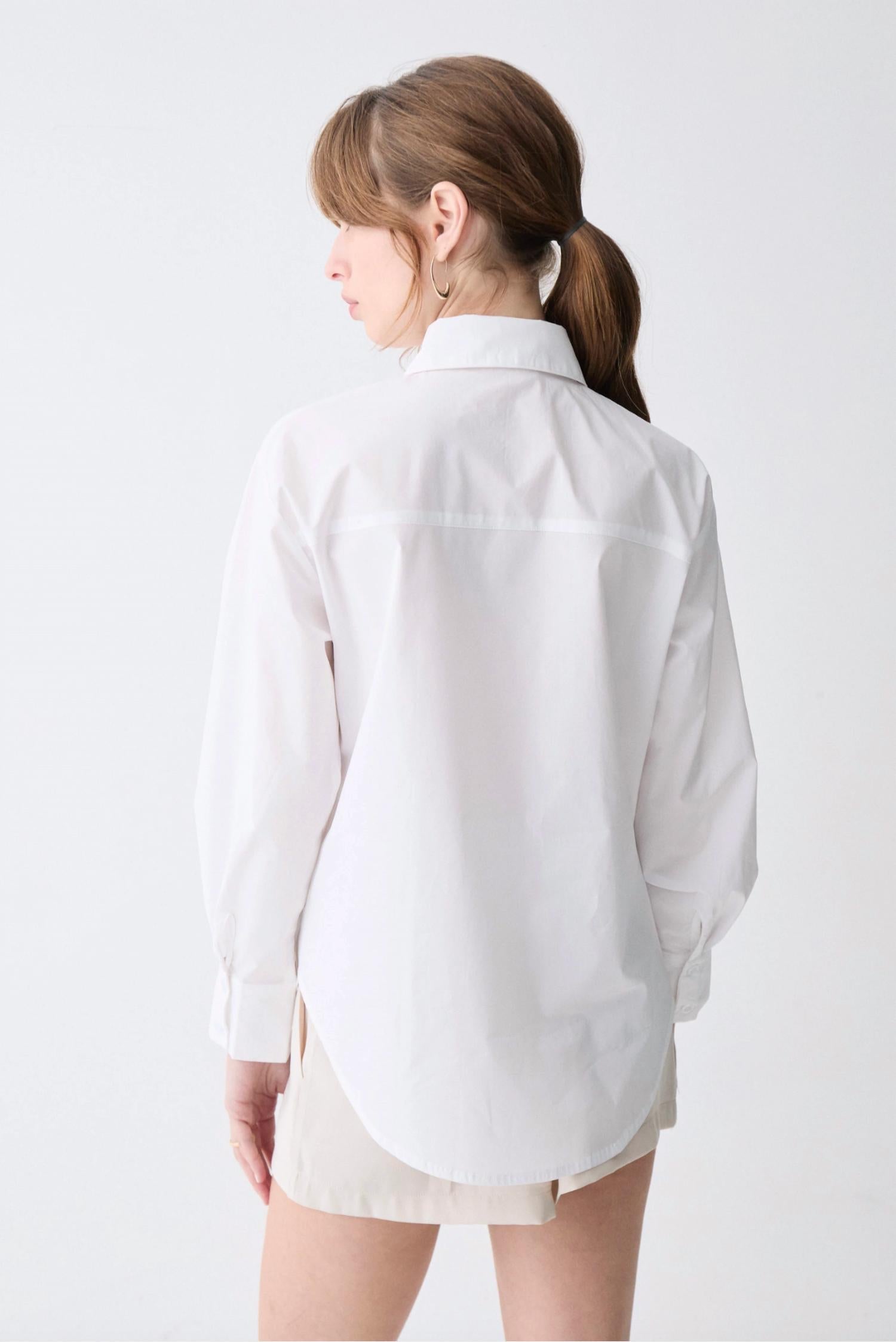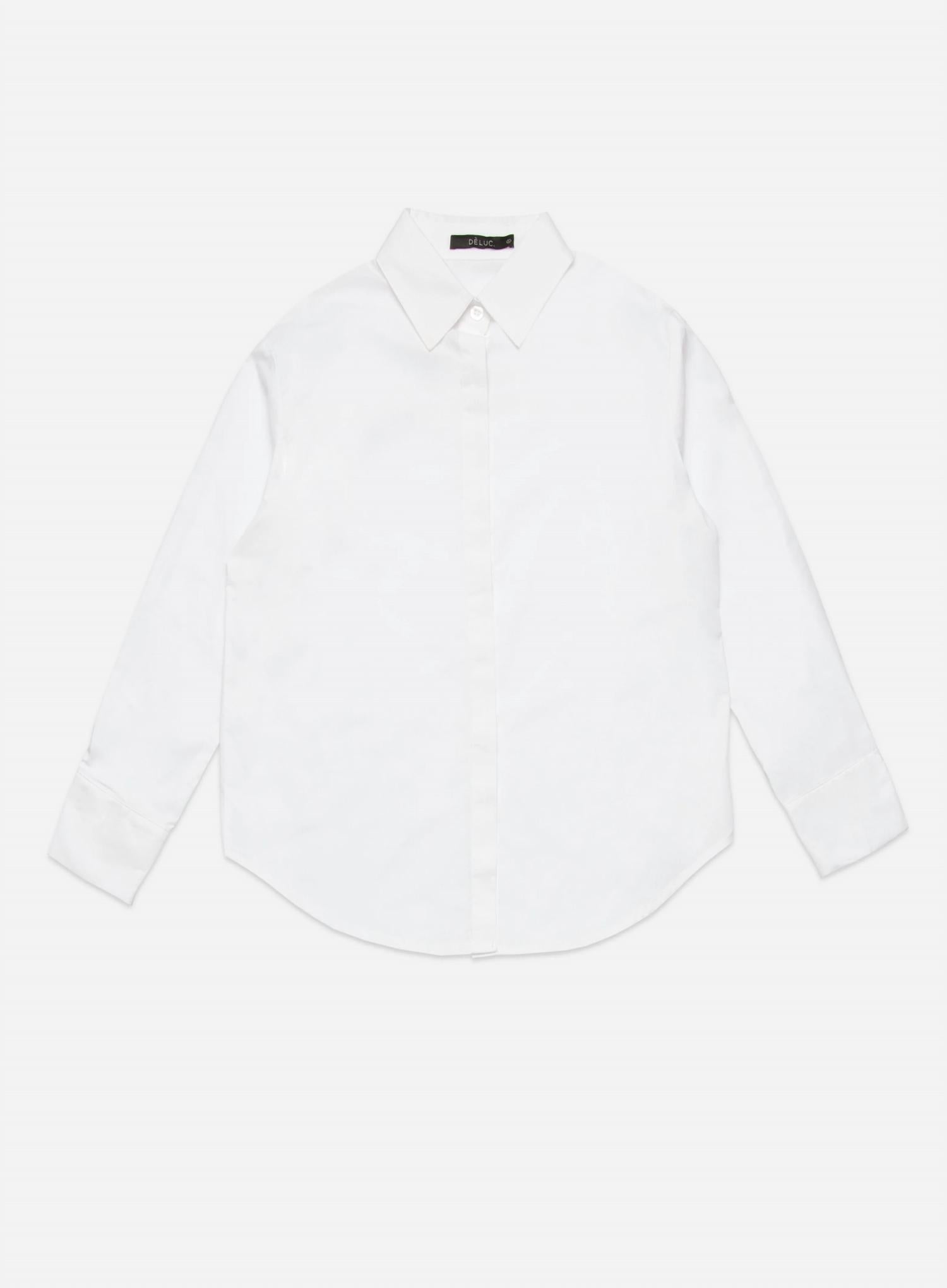 This button down shirt is comfortable yet polished. Introducing the Shauna Crisp Classic Button Down Shirt by DELUC, a timeless piece designed for the sophisticated woman. This poplin shirt in pristine white features long sleeves with buttoned cuffs and a stylish lapel collar. It offers a relaxed fit with a curved hem, complemented by a hidden placket for a seamless look. Designed for ease with a button closure, the shirt is perfect for versatile styling. Model is 175 cm/5'9" wearing size S.
