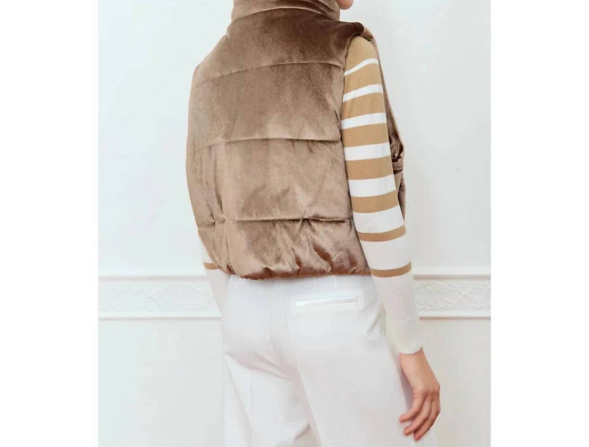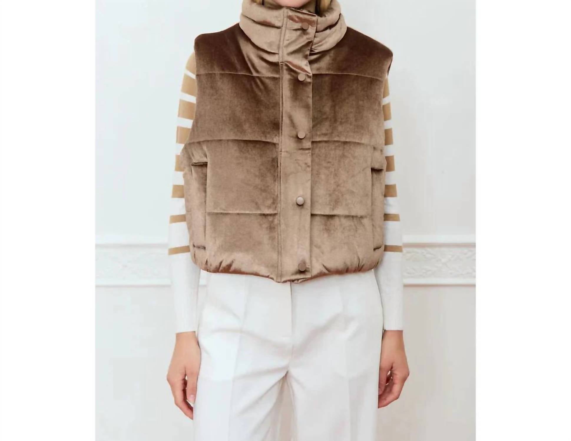 A vest so versatile you can mix and match it with almost any outfit and it will feel brand new every time. Mink-colored textured masterpiece that's equal parts stylish and practical. Sleeveless gilet. Crafted from 94% polyester and 6% spandex. Features a plush velvet finish. Designed with a collar and a stylish crop length. Ensures warmth and flair with a full snap and zip closure, alongside handy side pockets for added convenience.