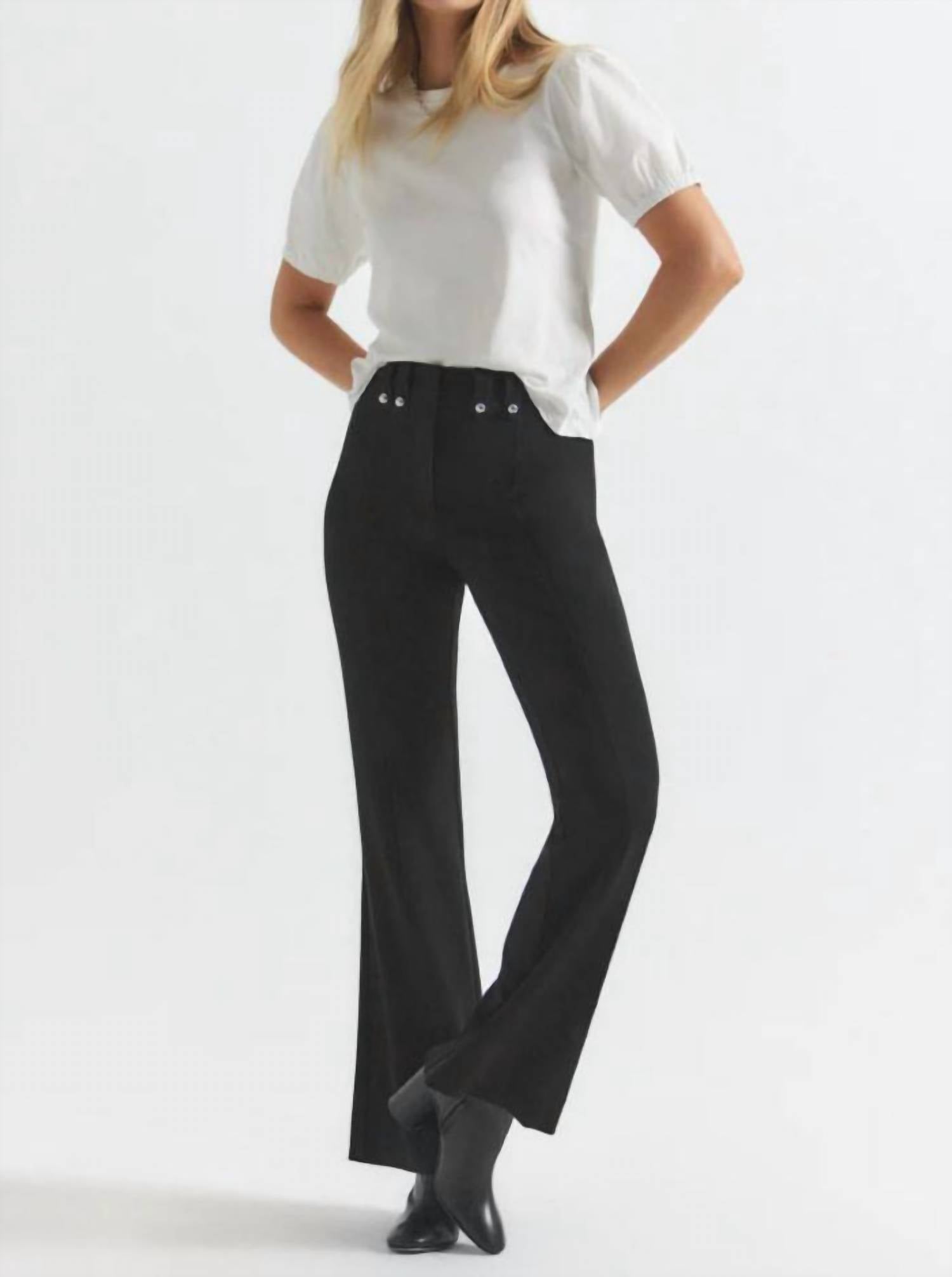 The Dawson Flare Trouser by Derek Lam 10 Crosby offers a sleek silhouette for the modern woman. Made from a stretchy blend of 32% polyester, 32% Livaeco, 30% recycled polyester, and 6% elastane, these trousers feature a mid-rise fit with a zip front and double tab closure. Custom button tab details at the waist and back welt pockets elevate its design, while the flared ankle and clean hem ensure a flattering finish. Care is easy, requiring dry cleaning only.