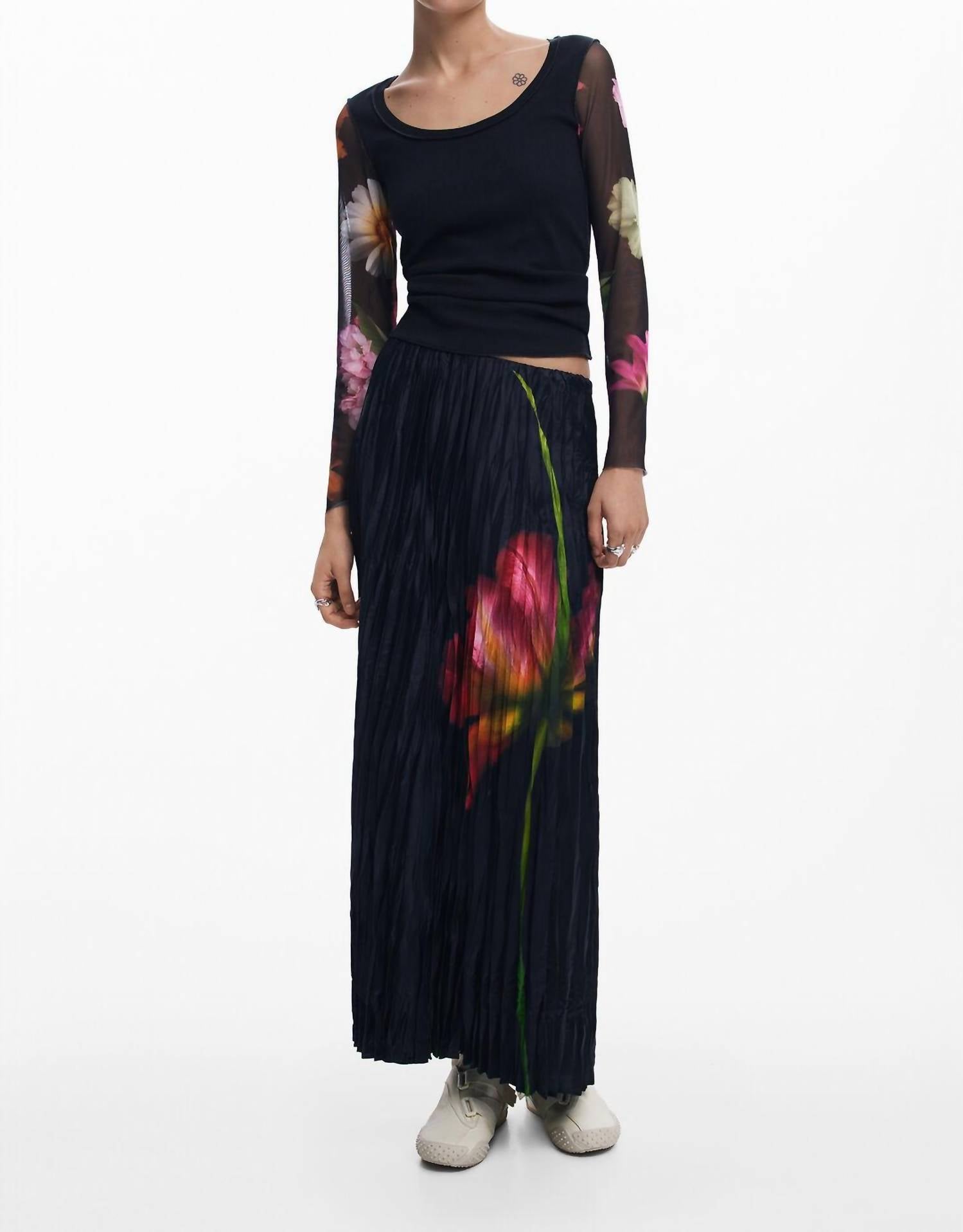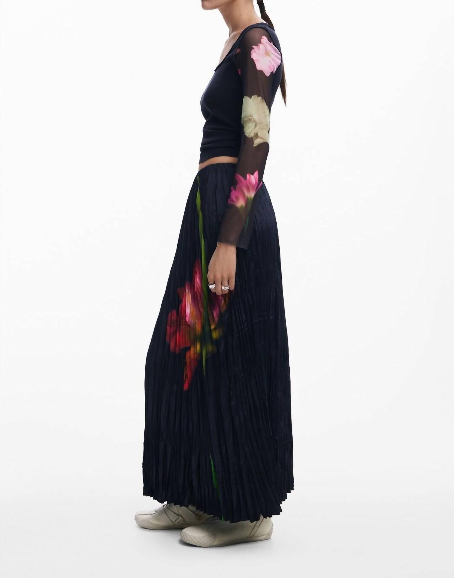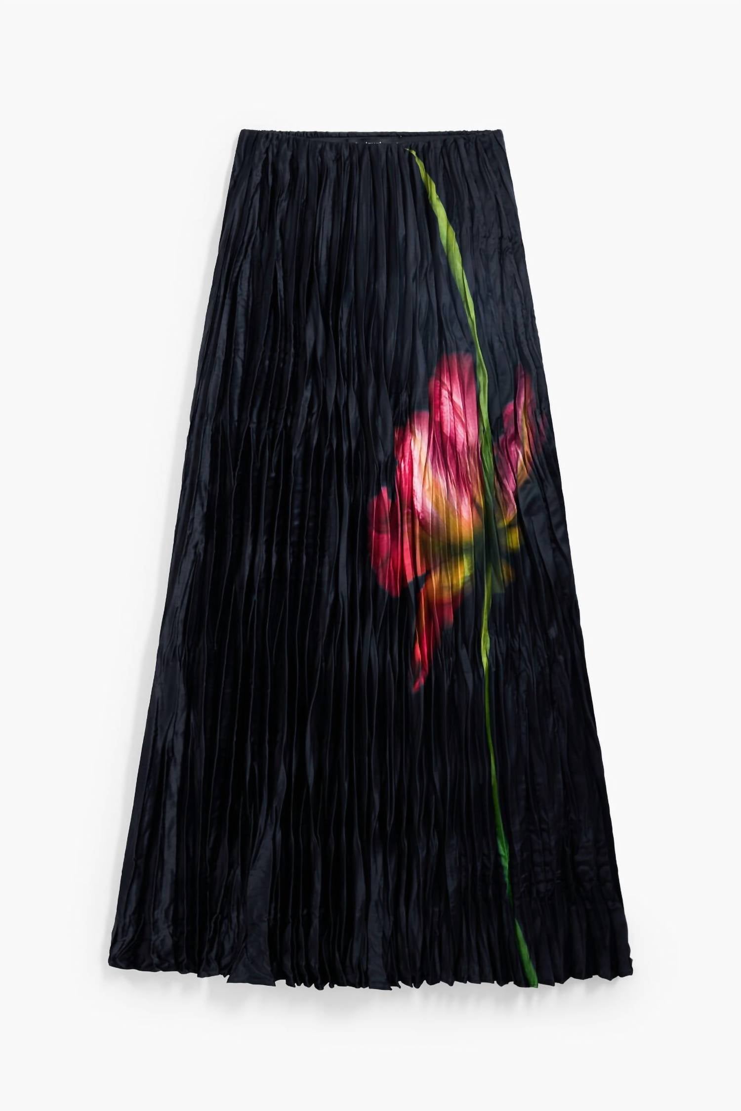 Flowy, comortable and stylish. This maxi skirt is a fan favorite. Long skirt with pleated and crinkled effect, solid color elastic waistband with floral print. Model’s measurements: Height: 176 cm; Waist: 64 cm; Hip: 87 cm Model size: M