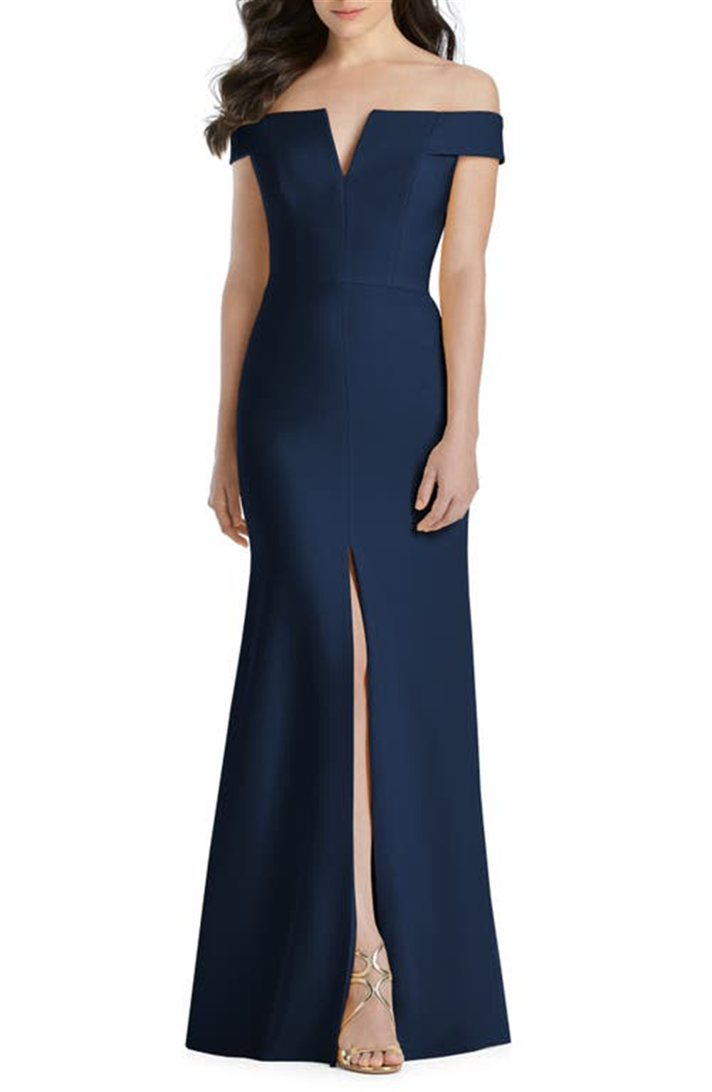 Dessy Collection Women's Midnight Notched Off the Shoulder Gown Size 12