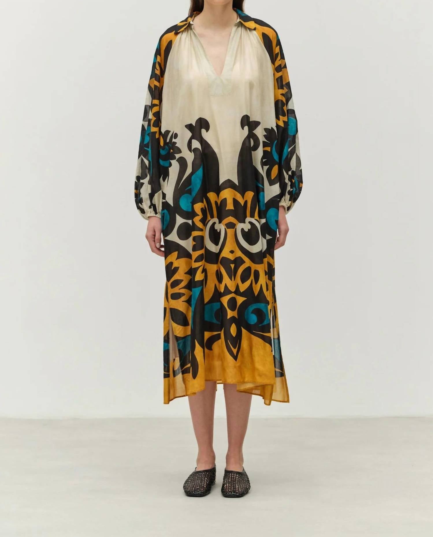 Who doesn't love a good maxi dress? This one you'll be reaching for season after season. Introducing the Chirpy Long Sleeve Maxi Dress by Devotion Twins, a timeless addition to your wardrobe that's perfect for every occasion. This patterned, long-sleeve dress is crafted from 100% cotton, ensuring lightweight comfort throughout the seasons. With a loose fit and wide arms, this shift dress features a stylish V-neckline and a versatile pull-on closure. Ideal for spring wear and beyond, it measures 24cm in length, with a chest of 70cm and hips of 78cm in size S. Care for this exquisite piece with a gentle hand wash. The model is 179cm/5'87" and wears a size S.