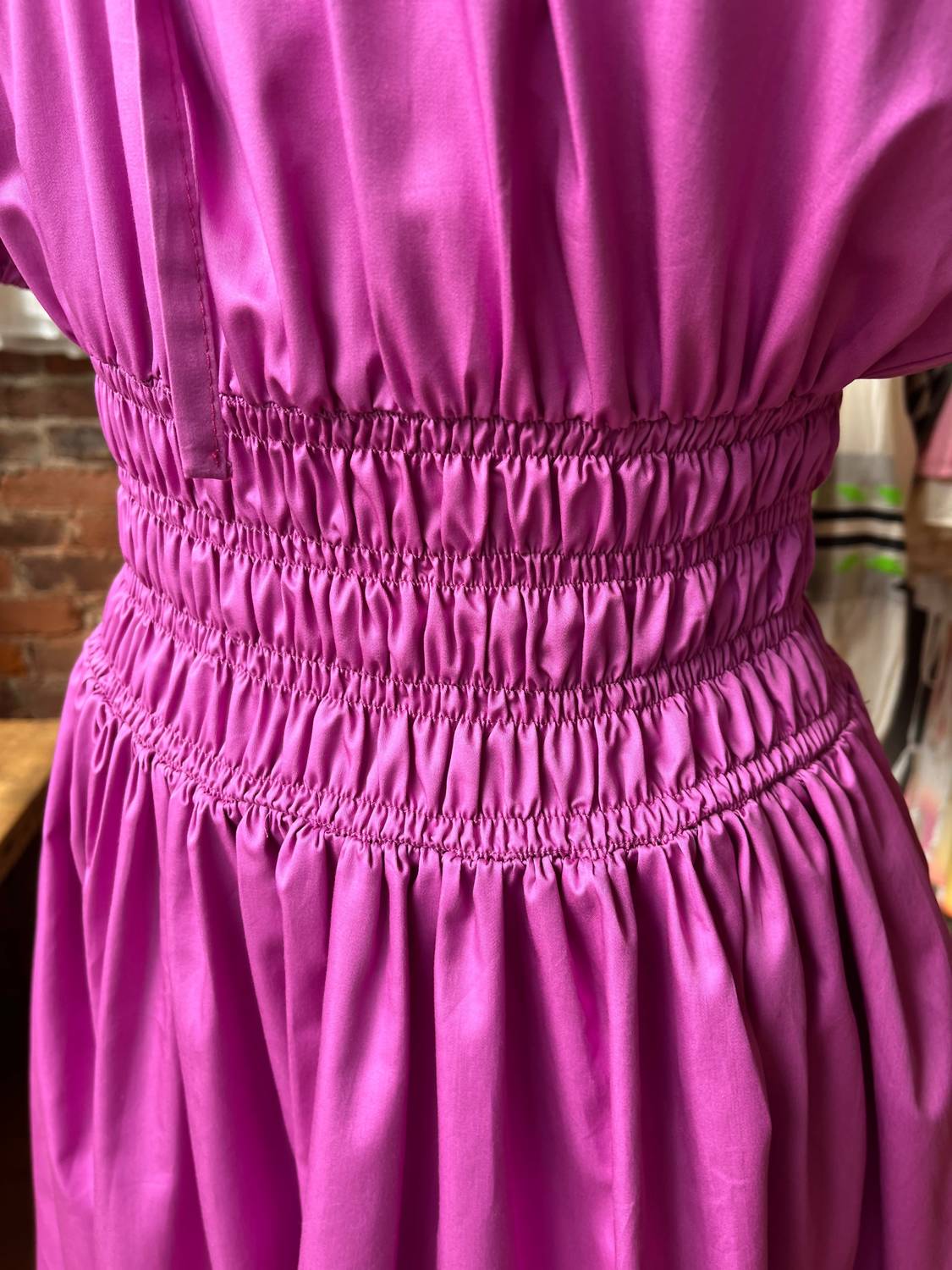 Introducing the Rania Midi Dress by DEVOTION TWINS, a standout piece in striking fuchsia perfect for spring occasions. Crafted with 100% sateen cotton, this dress combines a fit and flare silhouette with a cowl neckline and short sleeves for a flattering, breathable fit. The elastic smocking at the waist enhances your shape, while the tie string neckline ensures a customizable touch. Closure: Pull on. Care instructions: Machine wash and line dry for best results.