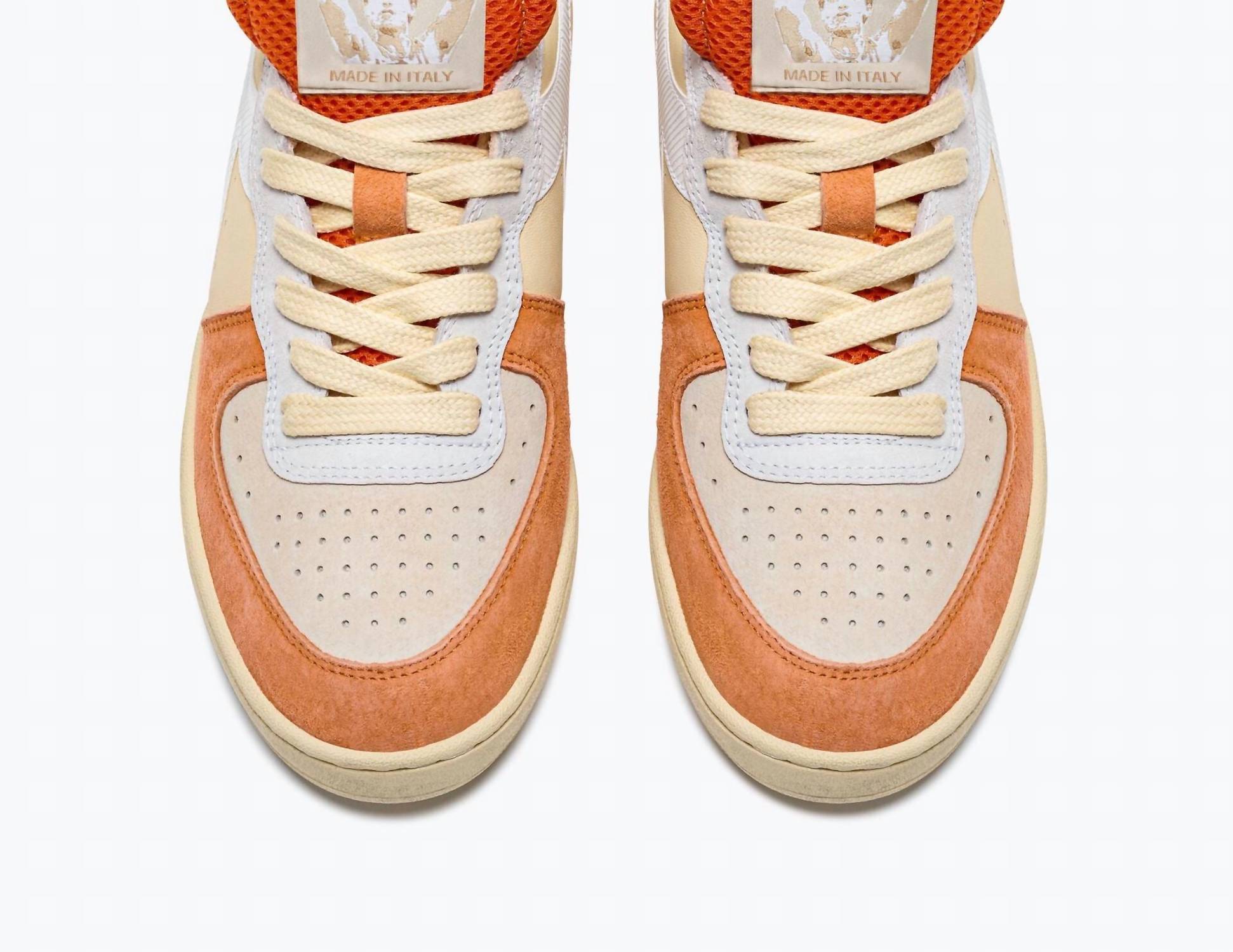 Introducing the Men's Mi Basket Row Cut Podio Italia Sneakers by diadora, a standout from the Heritage collection with its iconic retro-inspired design. Made in Italy from premium full-grain cow leather, pigskin leather, and mesh textile, these sneakers boast a stone wash and light wax treatment that add softness and a subtle sheen. Designed for streetwear aficionados, the sneakers feature a rubber outsole and cotton waxed laces with a lace-up closure, providing durability and style. Perfect for summer parties or casual days out, these bold vermillion orange sneakers seamlessly blend sports heritage with high-quality craftsmanship.