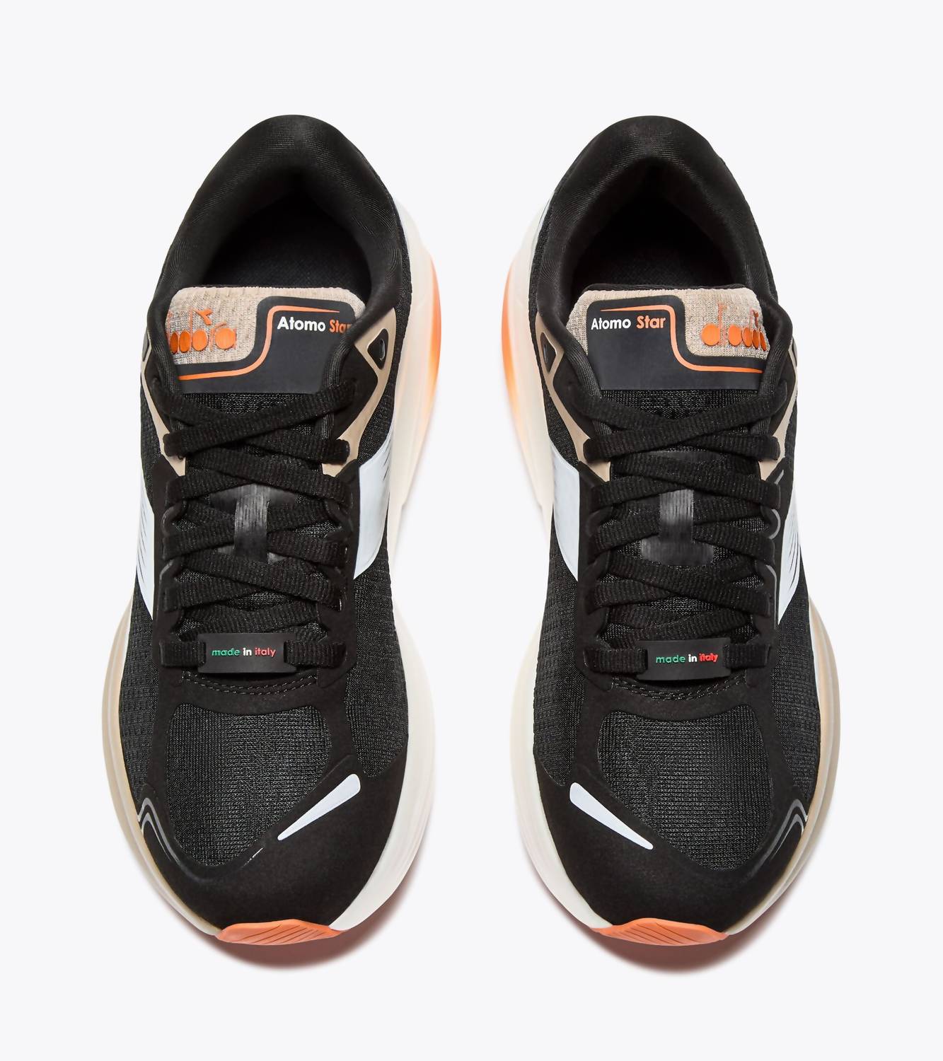 Elevate your athletic performance with the Diadora Unisex Atomo Star Sneakers in Black/White Humus, meticulously crafted for runners seeking peak efficiency. Designed in Italy, these sneakers boast a lightweight construction at just 275 grams and feature a round toe and flat heel style, ideal for summer athleisure activities. The nylon air mesh and microfibre upper ensure breathability, complemented by the ANIMA N2 midsole with a 40-34mm stack height for superior cushioning and energy return, and a 6mm drop for fluid transitions. Closure: Laces.