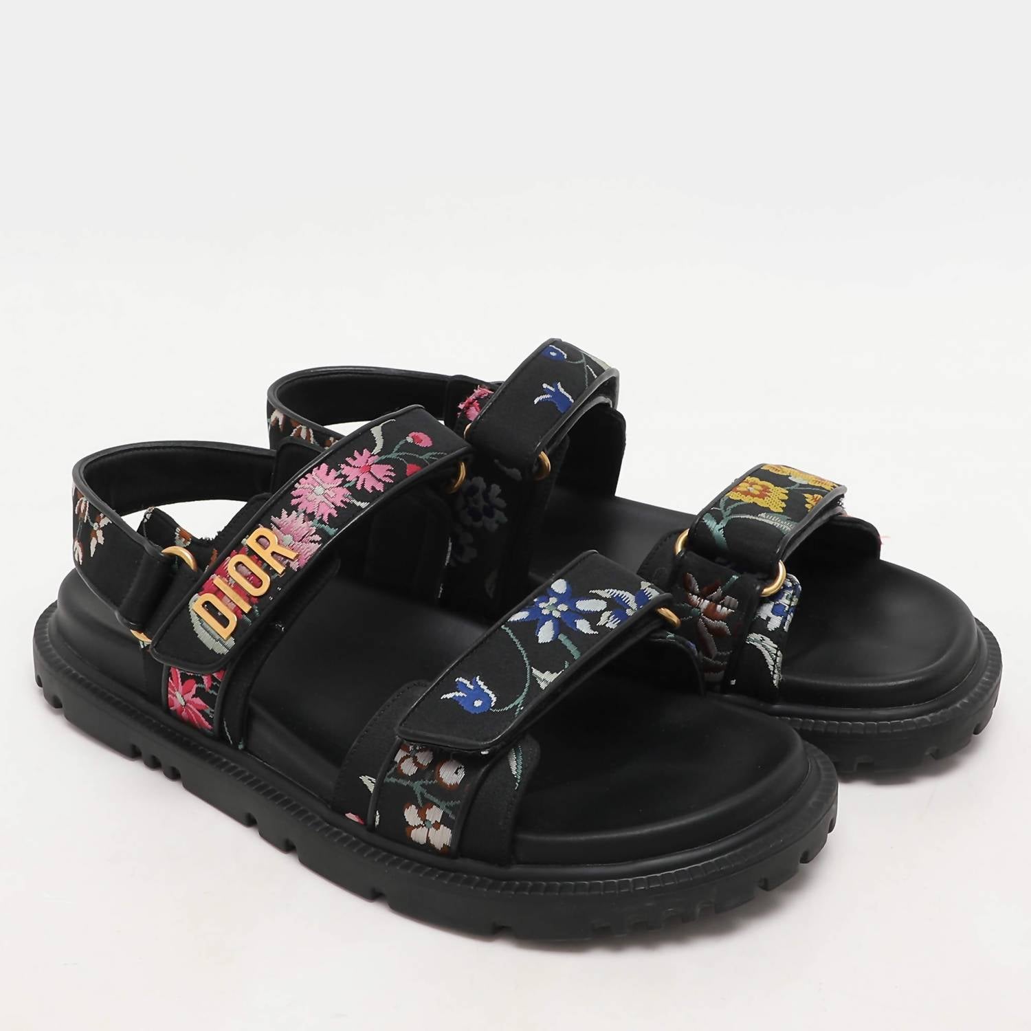 Step into summer in style with the Pre-loved Dior Women Floral Jacquard Dioract Flat Sandals, an ideal choice for your streetwear look. These multi-colored sandals feature an open toe design and a chic flat heel, perfect for travel; during the Easter holiday. Made to accompany every summer outing, they reflect the effortless elegance synonymous with the Dior brand. Enjoy these treasures that embody both comfort and trend-setting style. Condition: Excellent. Brand new and unused, but missing original box and dust bag.