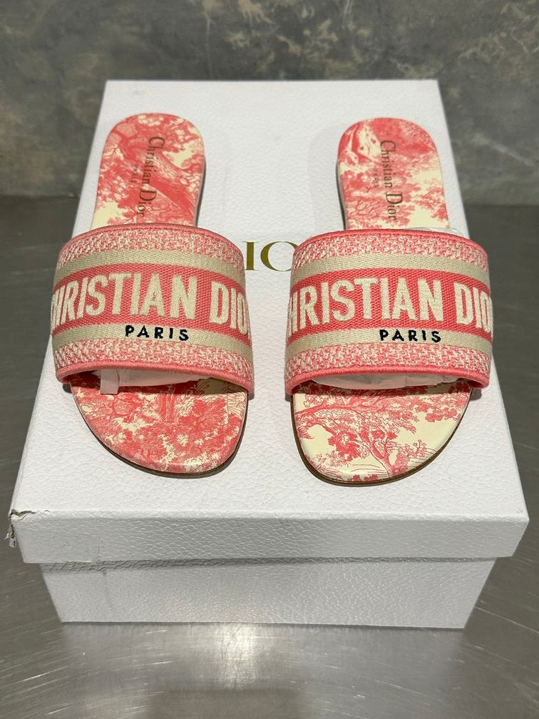 Dior Women's Dway Slides in Peony Pink Toile de Jouy Embroidered Cotton Size 6